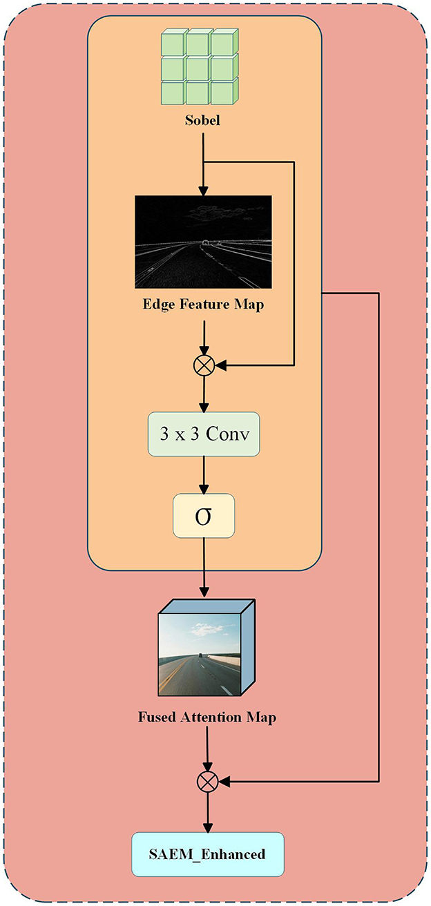 Figure 3. Enhancement of lane marking edge details via Sobel-based edge extraction, structural attention mapping, and feature fusion.