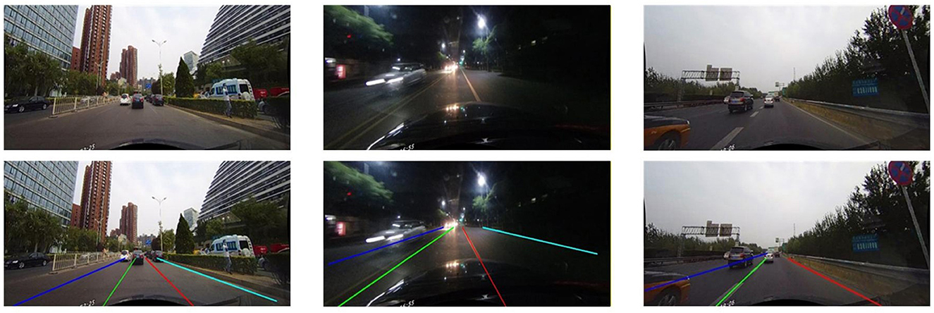 Figure 5. Visualization of lane detection results under various data conditions (images reproduced with permission from the CULane dataset, https://xingangpan.github.io/projects/CULane.html), licensed under CC-BY-NC.