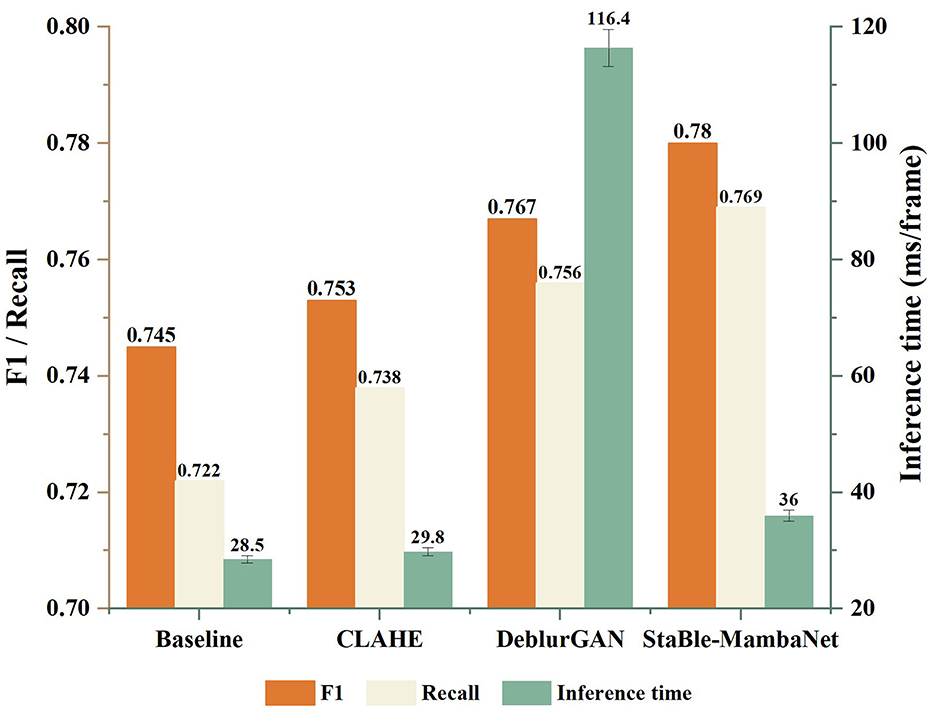 This paper compares the performance in terms of accuracy and inference time between the two-stage cascade approach “global restoration followed by lane detection” and Stable-MambaNet. Using CLAHE and DeblurGAN as preprocessing techniques respectively, both are connected to the same detection head (Baseline). For DeblurGAN, to ensure fairness, the network was not fine-tuned on the lane detection dataset but instead employed directly as a preprocessing module for the baseline detector. Inference was performed on the same hardware platform described in Section 4.1. During testing, the model operated with a batch size of 1 and utilized default optimization settings. Additionally, an ablation study is conducted on the SARM and BCRM modules of Stable-MambaNet using Baseline as reference. The results are illustrated in Figure 6. Regarding precision metrics, the CLAHE-based cascade yields only marginal improvements over the baseline: F1 increases from 0.745 to 0.753 while recall rises from 0.722 to 0.738, demonstrating limited utility of simple contrast enhancement for structural recognition. With the introduction of DeblurGAN, F1 further improves to 0.767 (recall = 0.756), indicating that global restoration can compensate for certain information losses caused by blurring. However, this accuracy gain comes at the cost of significantly increased inference time, reaching 116.4 ms/frame, which fails to meet real-time application requirements. In contrast, Stable-MambaNet achieves an F1 score of 0.780 and recall of 0.769 without global restoration, maintaining an inference time of merely 36 ms/frame. Compared to the DeblurGAN cascade, it delivers superior accuracy with reduced latency; relative to the CLAHE cascade, it exhibits substantial precision advantages while introducing only slightly higher delay than the baseline.