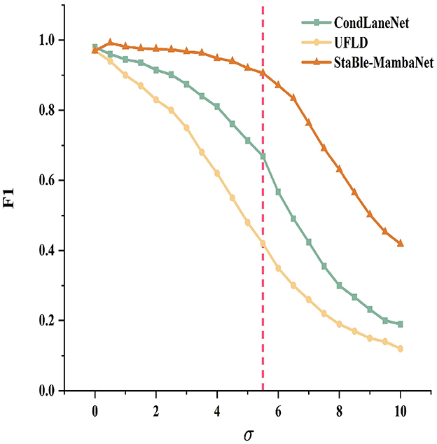 To simulate varying degrees of local information loss from mild to severe conditions, Gaussian blur with standard deviation σ was applied to lane marking regions. The degradation behaviors of Stable-MambaNet, CondLaneNet, and UFLD were evaluated through F1-σ curves as shown in Figure 7. Under mild blurring (σ ≤ 2), all three methods achieve near-perfect F1 scores with negligible differences. When σ≈3, CondLaneNet begins performance decline, whereas UFLD enters an earlier decay phase and maintains consistently lower performance throughout. At an intermediate blur intensity of approximately σ≈5.5, this threshold is demarcated by a vertical dashed line to indicate the critical point where performance disparities become amplified; furthermore, all methods exhibit an accelerating trend in their performance degradation. Under heavy blurring (σ>6), all approaches experience further degradation, yet Stable-MambaNet demonstrates a gentler slope of decline, preserving its maximum F1 advantage across a wider range. Overall, the proposed method exhibits more stable performance degradation trajectories across the entire spectrum of blur intensities, reflecting enhanced resilience to local information loss.