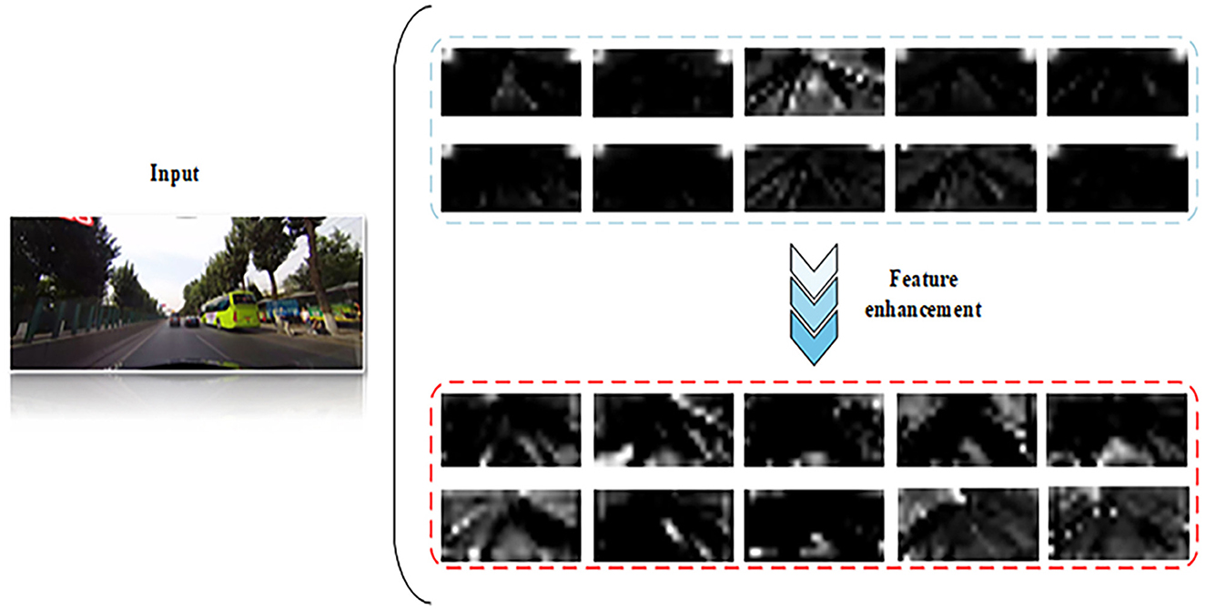 Figure 8. Visualization of Feature Maps Before and After Enhancement, (reproduced with permission from the CULane dataset, https://xingangpan.github.io/projects/CULane.html), licensed under CC-BY-NC.