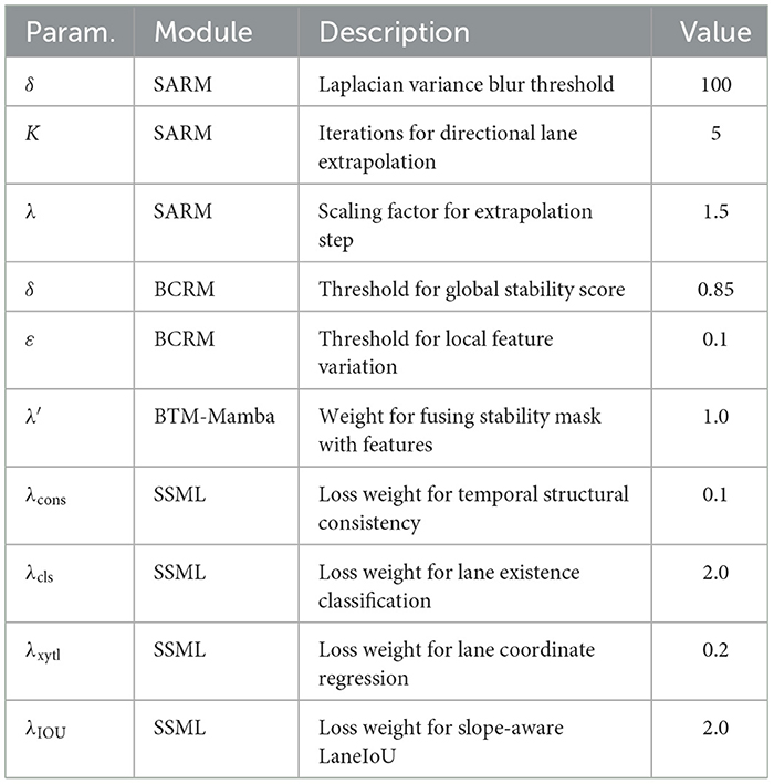 • Temporal modeling: blur-enhanced temporal modeling module (BTMM) with Mamba captures long dependencies through a state-space formulation applied to stability-weighted features, providing efficient temporal representation without indiscriminate sequence aggregation, while multi-objective optimization (SSML) combines cons and slope-sensitive LaneIoU for accuracy.