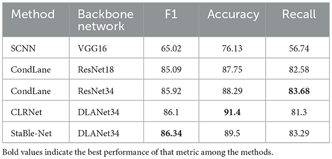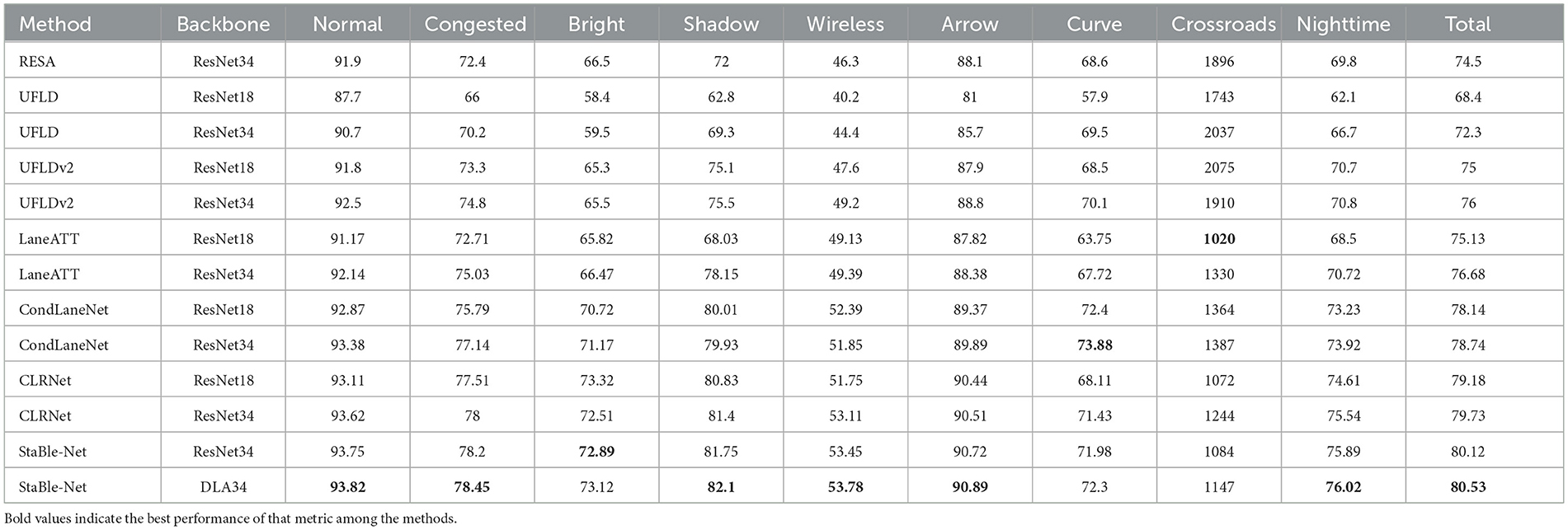 Based on the selected backbone network versions, the medium-sized ResNet34 variant of StaBle-MambaNet demonstrates superior performance across all metrics compared to mainstream anchor-based detection models using the same ResNet34 architecture. For instance, when benchmarked against CondLaneNet (Liu L. et al., 2021), StaBle-MambaNet achieves a 1.38 percentage point improvement in F1 score while exhibiting varying degrees of performance enhancement across diverse scenarios. Furthermore, employing DLANet34 (Su et al., 2022) as the backbone network elevates the overall model performance, attaining an optimal F1 score of 80.53. Notably, it successfully leverages inter-frame temporal dynamics to enhance robustness in challenging conditions such as nighttime illumination, shadows, and wireless interference–demonstrating broad environmental adaptability and providing a more stable solution for lane marking detection during daily driving operations.