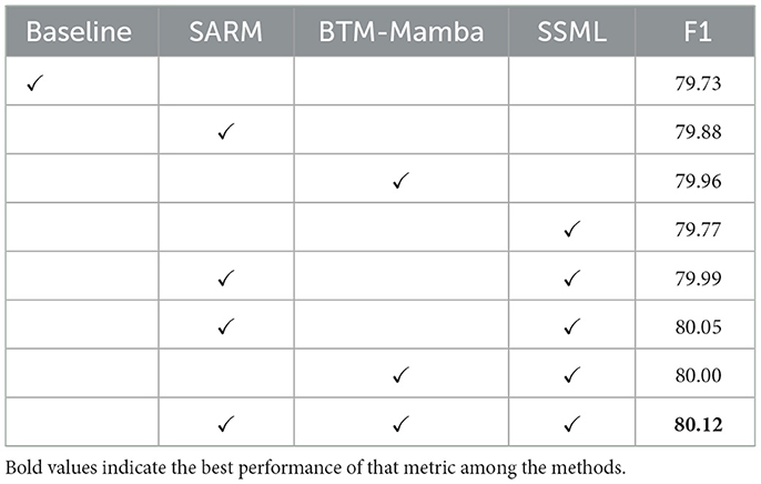 Evaluate the contribution values of each component's functionality within the lane detection framework StaBle-MambaNet proposed in this chapter. Table 4 demonstrates the impact of different components in StaBle-MambaNet on the final model performance. Throughout the ablation study, StaBle-MambaNet employs ResNet34 as its backbone architecture and conducts experiments on the CULane dataset. The experimental results presented in Table 4 indicate that incorporating each component yields positive effects on the F1 score–a key detection metric for StaBle-MambaNet–with optimal overall model performance achieved when all modules are utilized collectively. Baseline model: without incorporating the SARM and BTM-Mamba modules, the baseline model achieved an F1 score of 79.73.