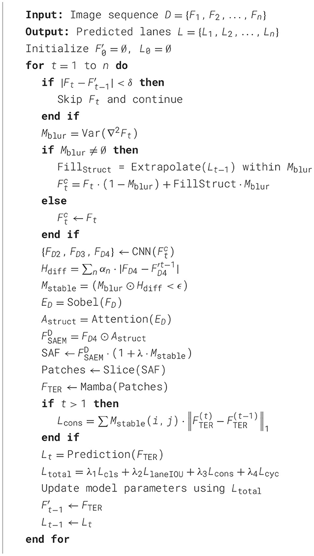 State Space Models (SSMs) have long served as an efficient tool for temporal modeling, widely employed to capture long-range dependencies in dynamic systems. However, conventional SSMs typically rely on recursive inference, resulting in low computational efficiency and difficulties in handling complex tasks involving long sequences and high-dimensional inputs (Gu and Dao, 2023). To address this limitation, the Structured State Space Sequence Model (S4) significantly improved modeling efficiency by introducing convolution over latent states, thereby validating for the first time the effectiveness of structured state space models in long-sequence modeling (Somvanshi and Islam, 2025). Building upon this foundation, the Mamba model was proposed as an enhanced variant of S4. By incorporating a dynamic weighting mechanism and a hardware-friendly parallel scan architecture with sliding windows, Mamba achieves linear time complexity in sequence modeling (Gu and Dao, 2023; Liu et al., 2024). The Mamba block consists of a gated MLP, a state-space transformation (an improved S4), and residual connections, employing the SiLU or Swish activation function to effectively integrate sequential and spatial modeling capabilities (Bansal et al., 2024). Specifically, Mamba designs the original state matrix A, input matrix B, output matrix C, and step size S as functions of the input sequence, dynamically generating parameters through projection mechanisms that adapt to the input data, thereby enhancing the model's adaptability to sequential variations (Rando et al., 2025; Liang et al., 2024). Equation 16 enables Mamba to model temporal dependencies in blurred lane regions by dynamically adjusting matrices A, B, C, and step size S, enhancing detection robustness under varying conditions.