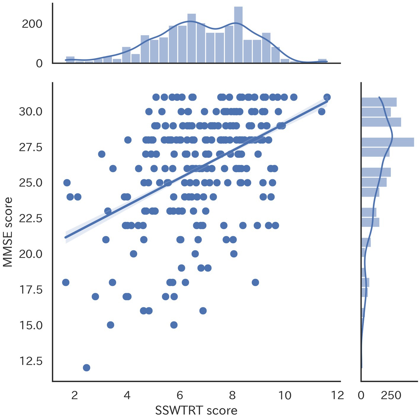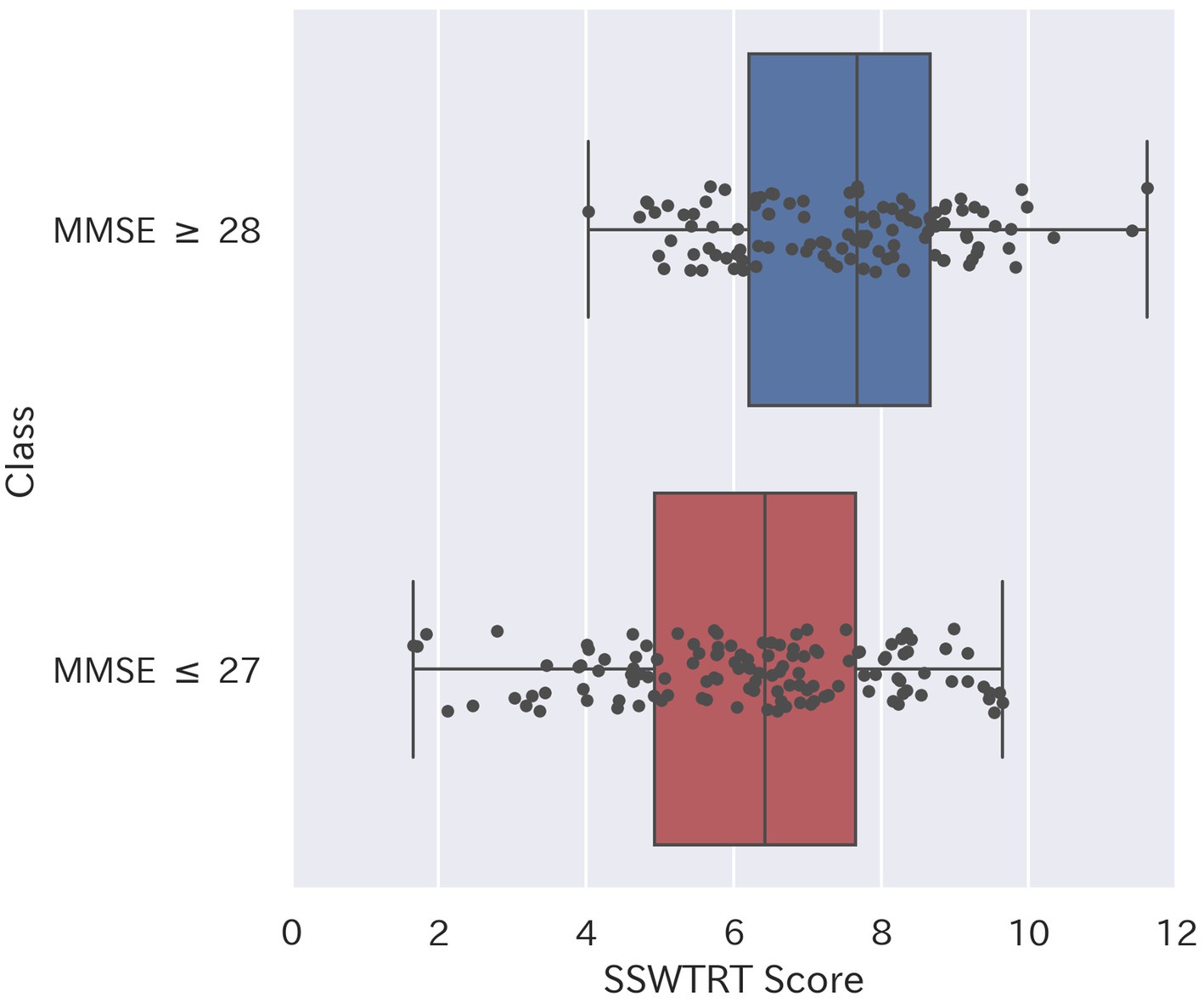 Figure 4 shows the box plot of the SSWTRT scores divided into two groups based on the MMSE score. In this study, a cutoff indicating cognitive decline was set based on previous research on the criteria for diagnosing MCI, and participants were divided into two groups (Cuoco et al., 2025; Zhang et al., 2021).