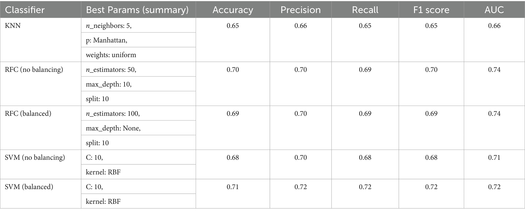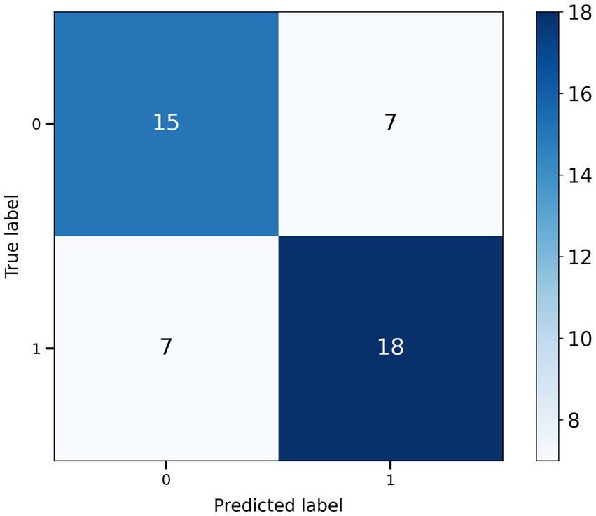For each method, we optimized each model using the hyperparameters in the ranges shown in Table 2 and compared the performance of each model on five indices: accuracy, precision, recall, F1 score, and AUC (ROC-AUC score) (Table 3; Figure 5). The best performance, except for AUC, was achieved using SVM with SMOTE. The best model had accuracy = 0.71, precision = 0.72, recall = 0.72, F1 score = 0.72, and AUC = 0.72. The confusion matrix for the classification results for 47 validation set samples (20% of 233 total participants) using this model is shown in Figure 6.