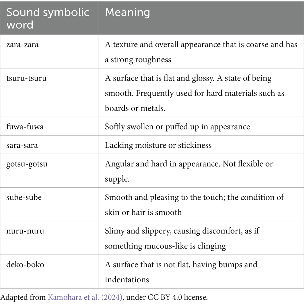 When communicating the textures to others, sound symbolic words (SSWs) are often used, especially among Japanese people. In this context, synesthetic associations between sounds and sensory experiences (sound symbolism) have been proven for several decades (Jespersen, 1921; Newman, 1933; Taylor, 1963; Werner and Wapner, 1952; Brown et al., 1955; Hinton et al., 2006; Nuckolls, 1999; Wertheimer, 1958; Sapir, 1929).