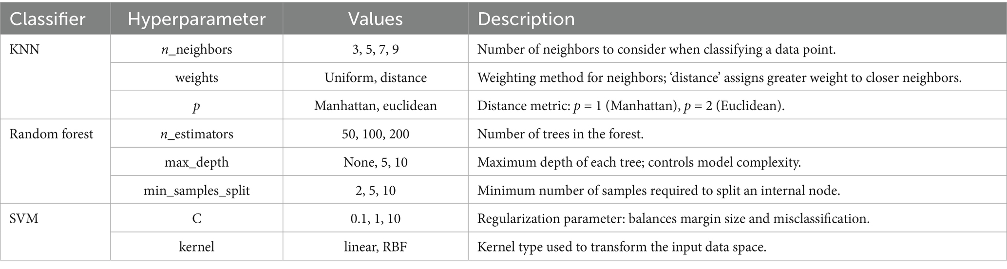 Using the differences in response trends between groups in the SSWTRT discussed in the previous section, we designed a machine learning model to classify subjects with an MMSE score of 27 or less, suspected of having mild cognitive impairment. In addition to the scores of each subject’s responses to the 12 questions, we included age and years of education as input features, with missing values in years of education imputed by the mean. We applied three machine learning methods: K-nearest neighbors (KNNs), random forest classifier (RFC), and support vector machine (SVM). For RFC and SVM, we evaluated models both with and without applying balance control techniques (Bach et al., 2019; Chawla et al., 2002; Lin et al., 2020) designed to improve performance on minority classes in imbalanced data. Model performance was evaluated using 5-fold cross-validation, based on accuracy, precision, recall, F1 score, and AUC, selecting the model that achieved the highest F1 score. For hyperparameter tuning with 5-fold cross-validation, the dataset was divided into five folds, and for each candidate set of hyperparameters, the model was repeatedly trained on four folds and evaluated on the remaining one. The five evaluation scores obtained were averaged, and the hyperparameters yielding the best mean performance were selected. Finally, the model was retrained on the entire dataset using the optimal hyperparameters to obtain the final model.