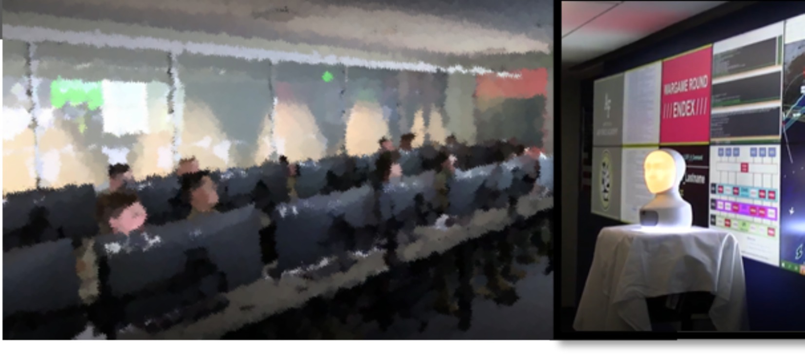 Figure 2. Operational setting of the Multi-Domain Laboratory (MDL) exercise in which cadets collaborated with the Socially Intelligent and Ethical Mission Assistant (SIEMA). The figure shows the high-fidelity command-and-control environment used during the three-month teaming period including the Furhat-based robotic SIEMA positioned alongside mission displays.