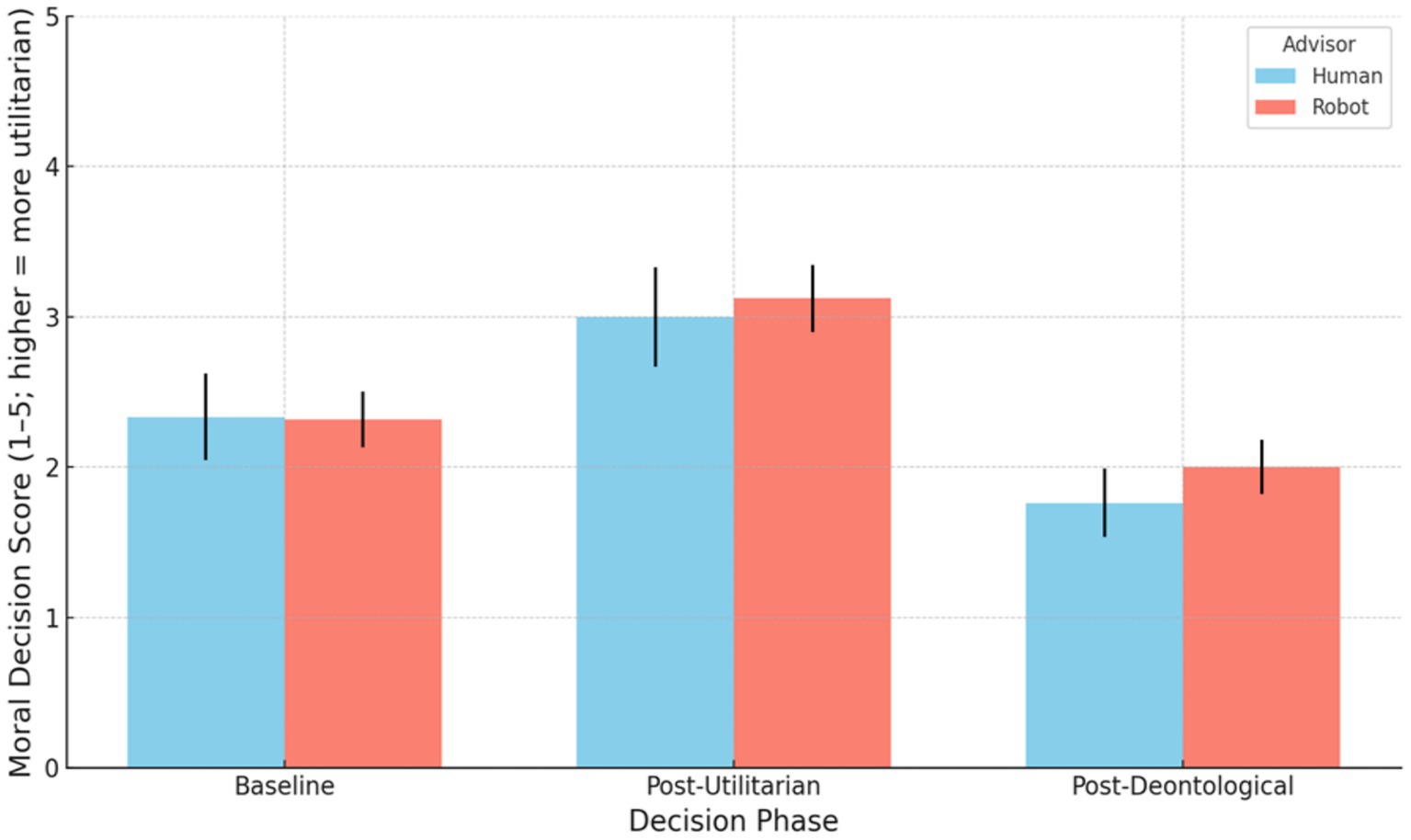 Figure 3. Distributions of mean moral decision scores (1–5 scale; higher = more utilitarian) at Baseline, after Utilitarian (PA1) advice, and after Deontological (PA2) advice (“Final”), split by advisor type (Human vs. Robot). Error bars = ±1 SEM.