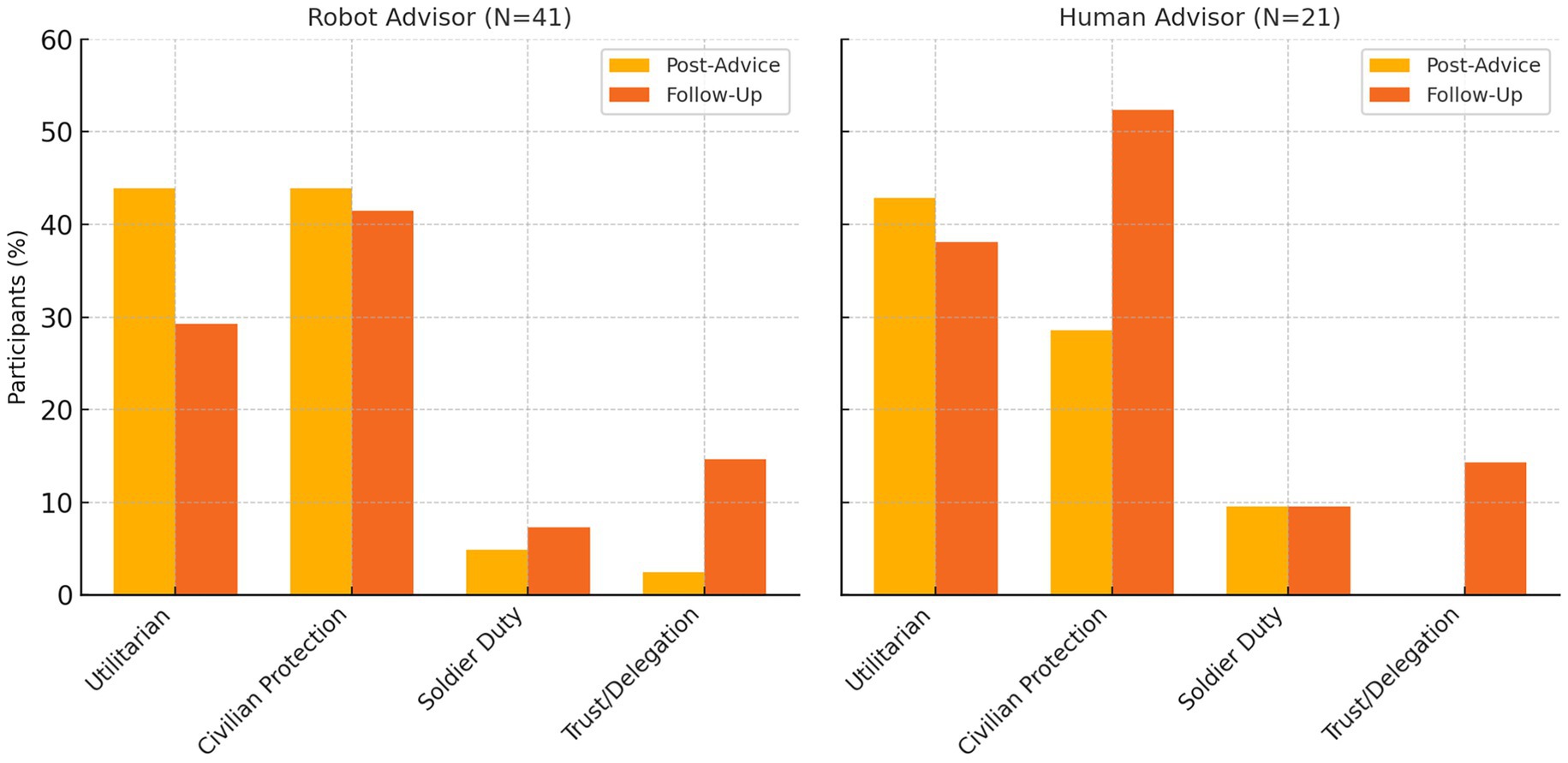 Figure 4. Prevalence of key reasoning themes in participants’ explanations, by advisor condition (robot vs. human) and timepoint (immediately PA1 vs. PA2). Percentages reflect the share of participants who mentioned each theme in their open-ended responses. “Civilian Protection” combines deontological statements about avoiding harm to innocents; “Utilitarian” denotes explicit mission/calculus to minimize total casualties; “Soldier Duty” refers to emphasizing the soldier’s role or sacrifice; “Trust/Delegation” includes references to trusting or distrusting the advisor.
