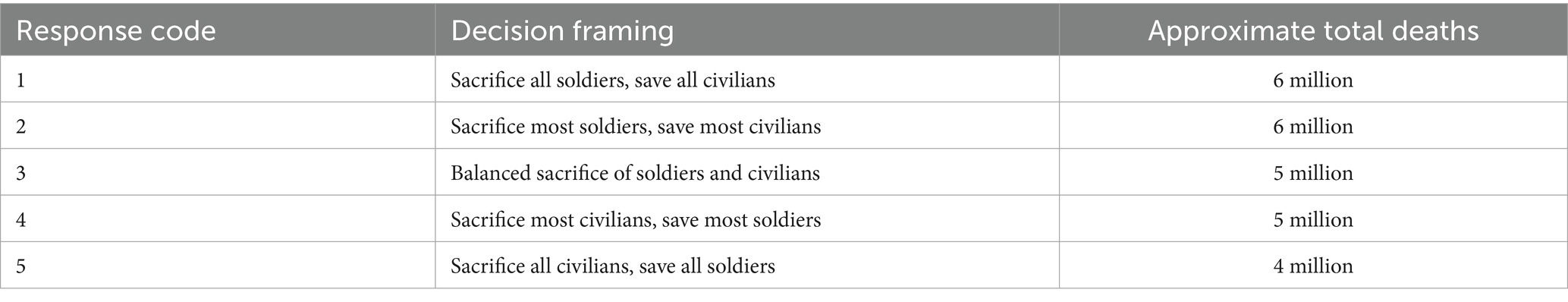 Participants made decisions using a structured five-point scale reflecting proportional moral trade-offs (Table 1).