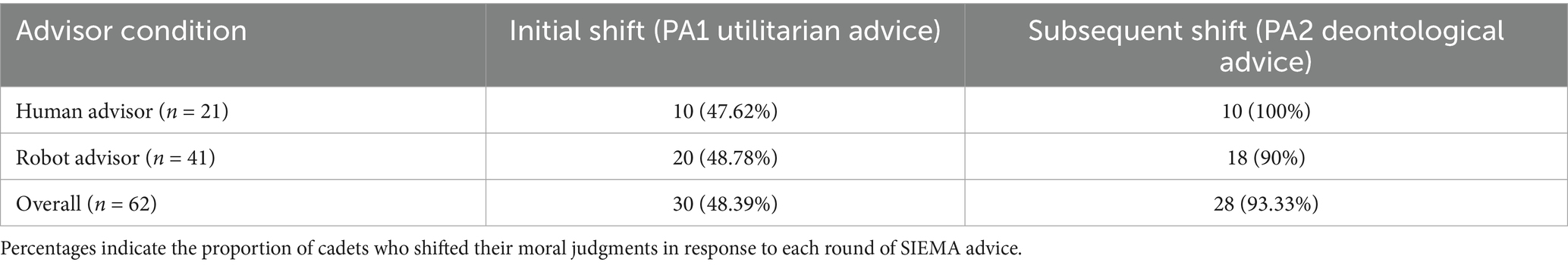 After receiving advice from SIEMA, 48.39% of cadets (30 out of 62) shifted their moral judgments in response to the SIEMA’s initial advice to minimize overall casualties. Analyzing this by advisor condition, participants advised by the robot were only slightly more likely to initially shift their decisions (20 out of 41, 48.78%) compared to those advised by the human (10 out of 21, 47.62%). Among those cadets who initially shifted, a remarkable 93.33% subsequently shifted again after receiving subsequent normative advice prioritizing civilian protection (PA2). When separated by advisor type, 100% of cadets advised by a human (10 out of 10) and 90% of cadets advised by a robot (18 out of 20) demonstrated this subsequent shift. Thus, cadets showed robust responsiveness to moral reframing, with human-advised participants displaying a complete consensus in recalibrating their ethical judgments when presented with explicit advice to minimize civilian death.