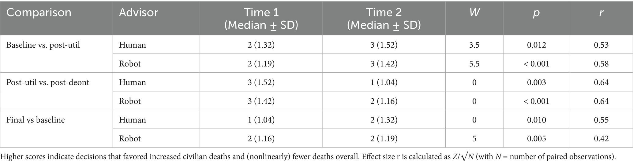Table 3. Medians (with standard deviations) of moral decision scores at each time point (baseline, post-utilitarian advice, final post-deontological advice) and Wilcoxon signed-rank test results comparing these time points, shown separately for Human and Robot advisor conditions.
