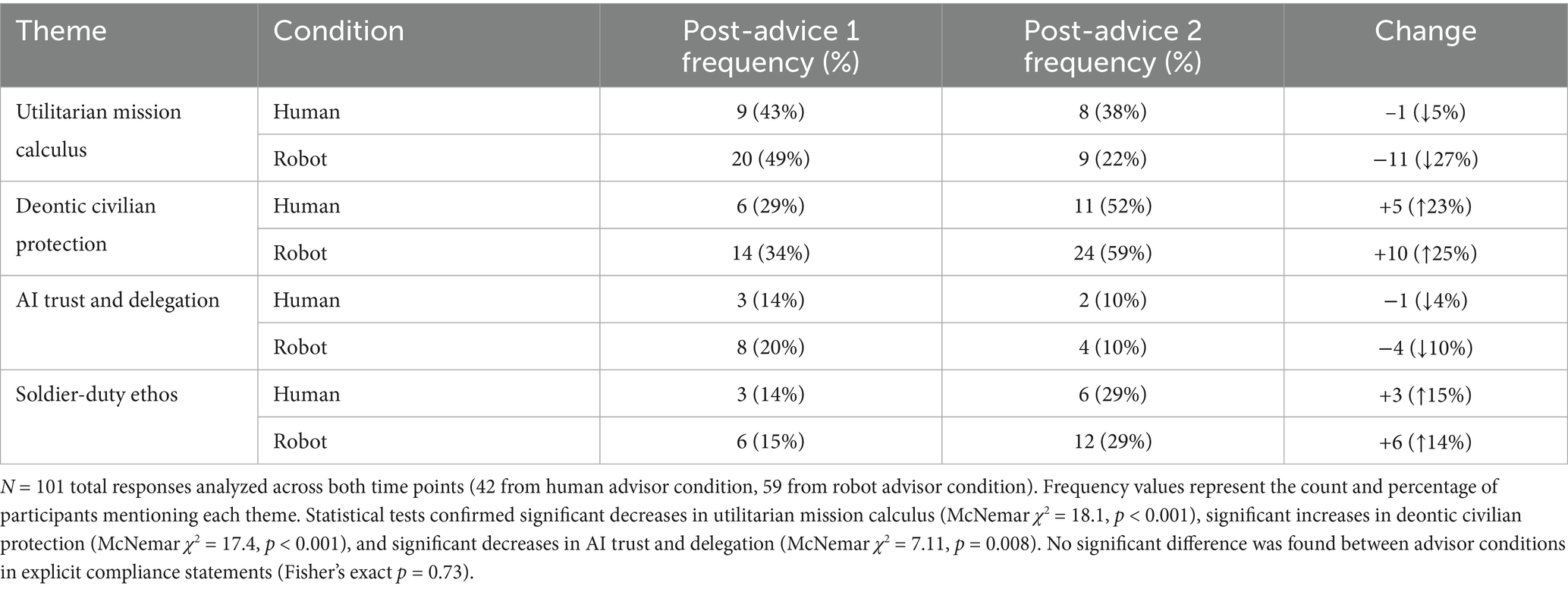 Statistical analysis of the coding frequencies confirmed several significant shifts in emphasis. The proportion of participants who mentioned a utilitarian mission calculus decreased significantly by PA2 (McNemar’s χ2(1) = 18.1, p < 0.001), consistent with the group-level abandonment of the utilitarian recommendation. Complementing this, references to deontic civilian-protection principles increased significantly (χ2(1) = 17.4, p < 0.001) from PA1 to PA2. Mentions of algorithmic trust in the SIEMA’s judgment also saw a significant drop (χ2(1) = 7.11, p = 0.008), as participants were less likely to say they trusted or followed the SIEMA’s data in the later scenario. Mentions of the soldier-duty ethos roughly doubled (14% → 29%), suggesting a trend toward greater acknowledgement of soldiers’ accepted risks, though this increase did not reach statistical significance in our sample (p > 0.05). It is worth noting that very few participants explicitly wrote that they were “just following the SIEMA’s orders” or similar sentiments in their explanations – such explicit deferential statements never exceeded 8% of responses at either time point. Moreover, this low level of blind compliance reasoning was comparable in both conditions (no difference between robot vs. human-advised groups; Fisher’s p = 0.73). This suggests that the mechanism of influence was not an unthinking obedience to the advisor, but rather a more implicit shift in the weighing of moral considerations (which was later consciously corrected by most participants). In sum, the qualitative data illustrate a clear narrative: immediately after receiving their SIEMA’s first initial recommendation, many cadets justified their choices with utilitarian calculations and trust in the advisor, but after their SIEMA changed their recommendation, their justifications shifted to emphasize moral rules and duties.