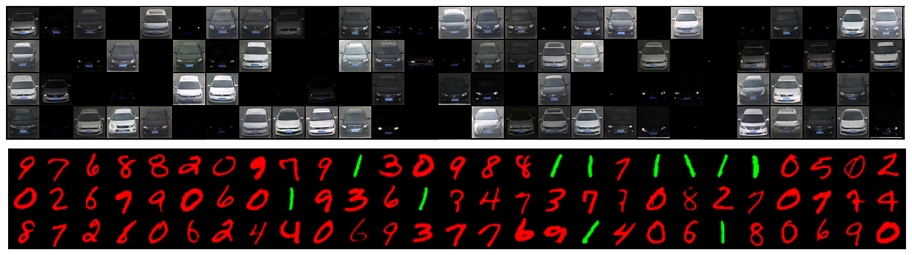 Collage showing multiple vehicle license plates in the top section and handwritten digits in the bottom section. Some digits are highlighted in green, while others are in red. The arrangement suggests a connection or comparison between the two sections.