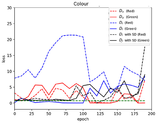 Figure 3 illustrates the discriminator loss for the color factor in MNIST data, with RGF present in digit “1” (Supplementary Section 4) presents results for other RGFs and digits). In this plot, solid lines depict the loss associated with images containing RGFs (i.e., green images), while dashed lines indicate the loss for images lacking RGFs (i.e., red images). A green horizontal dashed line represents the threshold loss at the discriminator's decision boundary between identifying images as real or fake, corresponding to a loss of log(2) when the discriminator output logit is 0.