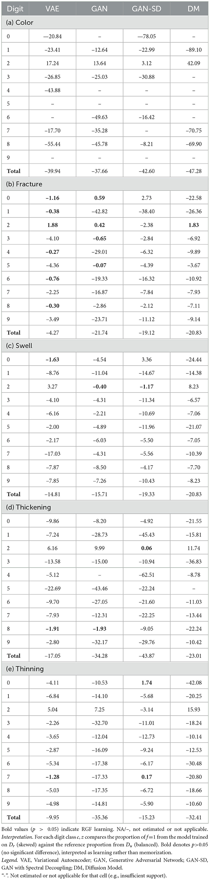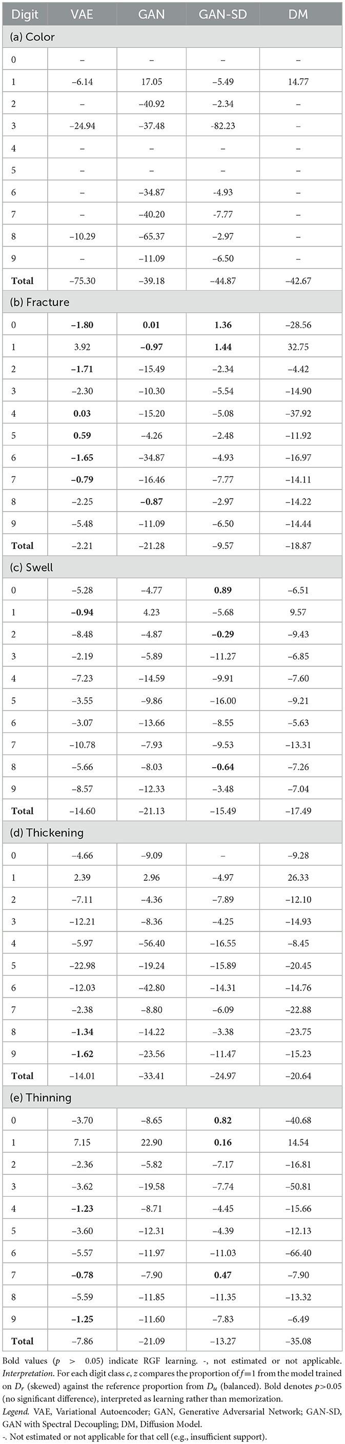 To evaluate the capability of generative models to learn RGFs, we calculate the p-value associated with each computed z-score zc for class c. When p-value >0.05, we uphold the null hypothesis, which implies that the model has effectively learned the generative factor. This outcome suggests that there is no significant difference between the expected and observed frequencies of the RGF among the generated instances, indicating successful learning by the generative model.