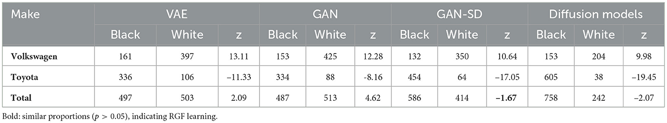 The large z-scores highlight the significant differences in proportions between Pc(u) and Pc(r), confirming the memorization effect. This memorization phenomenon is not limited to color in digit datasets. It extends, yet to varying degrees, across other generative factors we studied. In the case of car images, we observe a similar trend where the models tend to strongly associate color with a car make. The observed pattern suggests a broader trend: GANs and DMs exhibit a stronger tendency toward memorization of RGFs compared to VAEs, both in digit recognition and car classification tasks. Visual inspection suggests that DM provides the highest image quality, as shown in Figure 2, but at the cost of increased memorization (the images generated using VAE and GAN are shown in Supplementary Section 4. This different behavior across model types and datasets highlights the nuanced ways in which various generative architectures approach the challenge of learning from skewed data distributions.