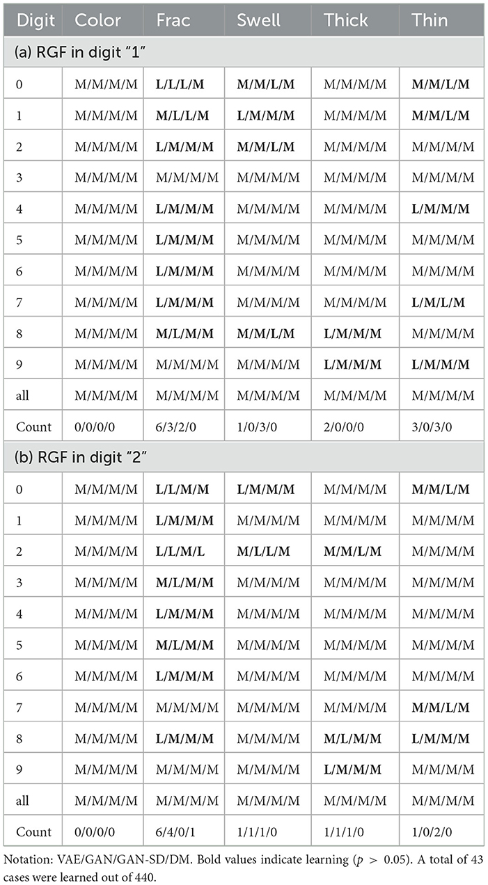 Table 4. Summary of RGF learning (L) vs. memorization (M) for digits “1” and “2.”