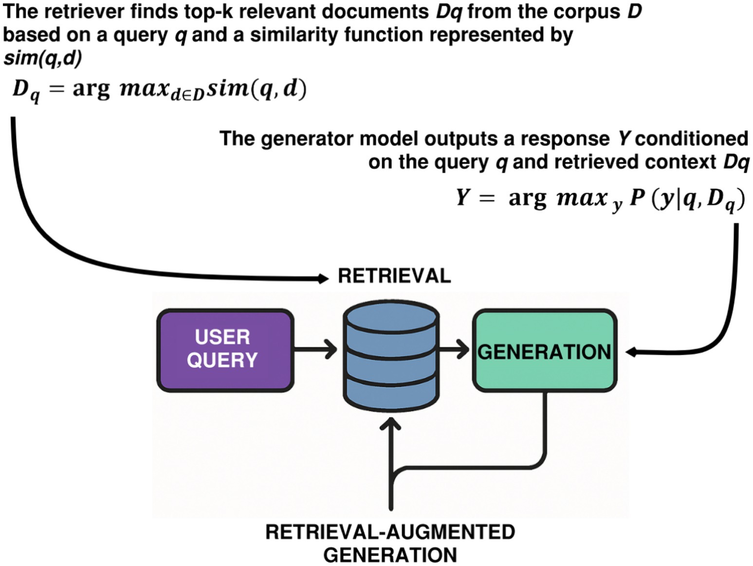 Figure 1. Illustration of RAG architecture, where a user query initiates a retrieval process from a knowledge base (e.g., vector database or document store).