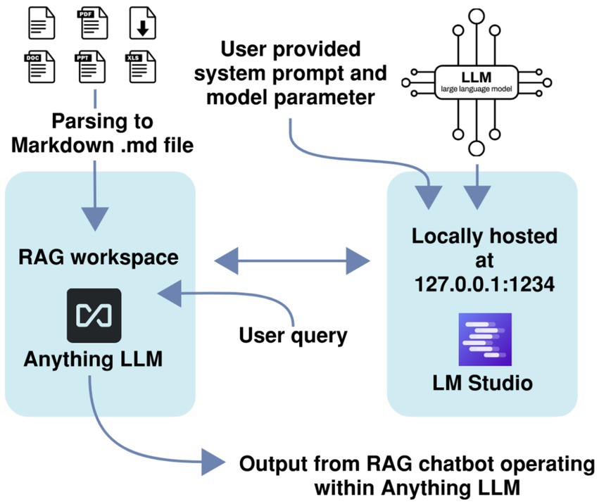1. RAG-LLM pipeline implementation: Example of a rapid deployable RAG-LLM pipeline, using LM Studio and AnythingLLM to secure local document retrieval and language model inference is provided. The code to be used for parsing and embedding corpus-specific documents is released and available through the ‘Data Availability’ section of the article.