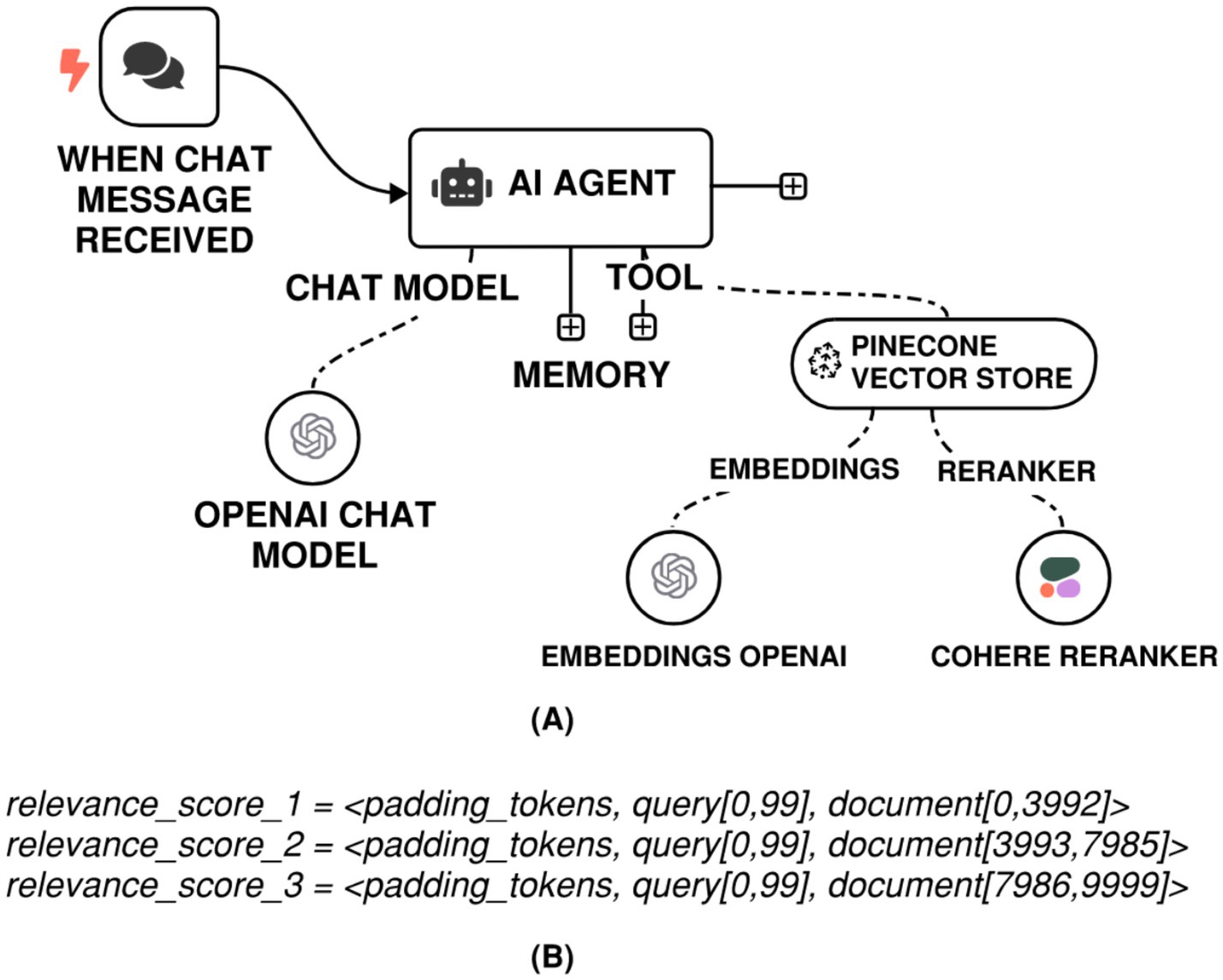 Figure 4. (A) n8n RAG-LLM workflow with Cohere reranking. (B) Relevant scoring based on Cohere chunking on a 10,000-token document.