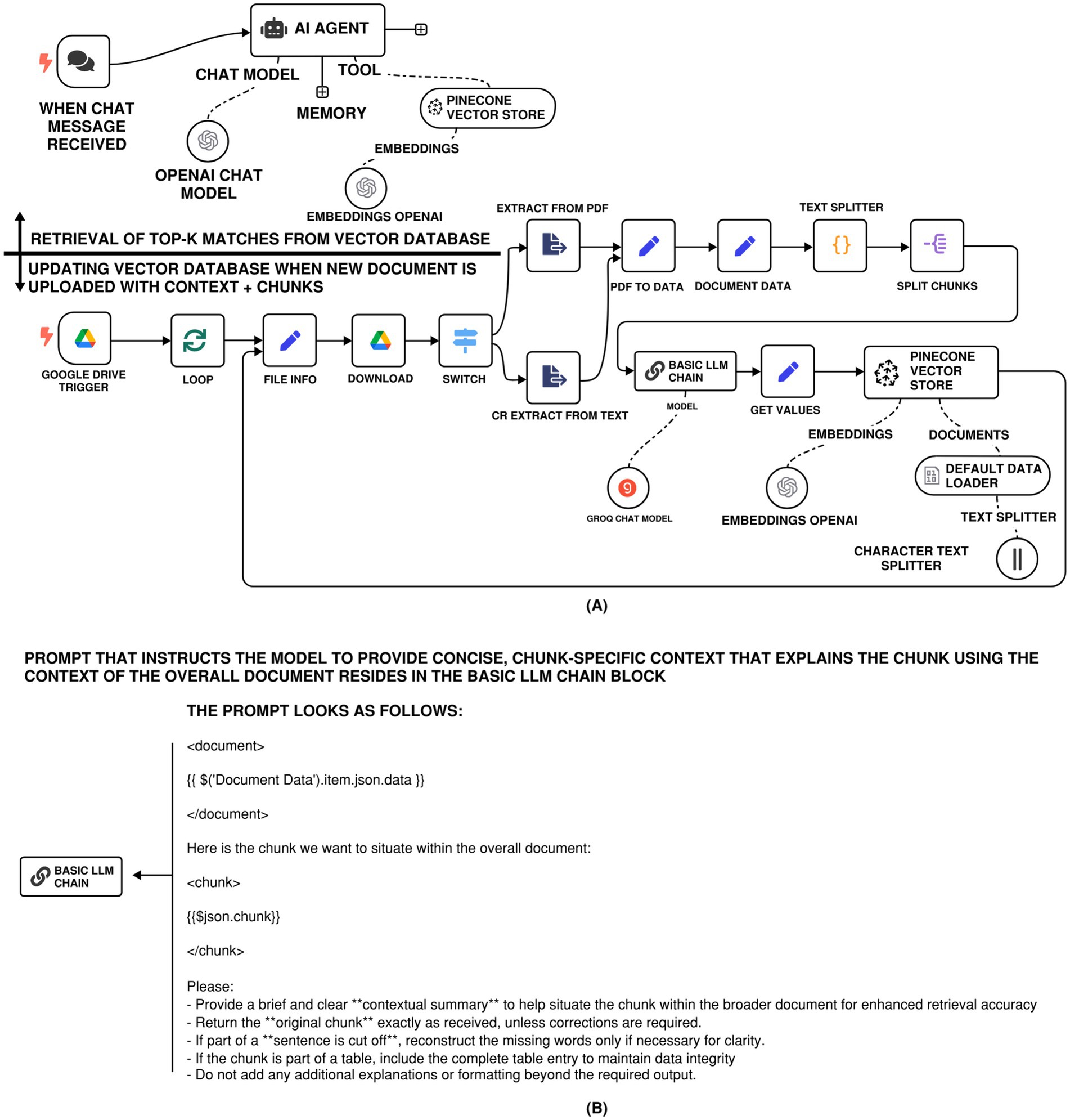 Figure 5. (A) n8n RAG-LLM workflow with contextual retrieval system allowing for prepending chunk-specific explanatory context to each chunk before embedding. (B) Prompt that instructs the model to provide concise, chunk-specific context that explains the chunk using the context of the overall document.
