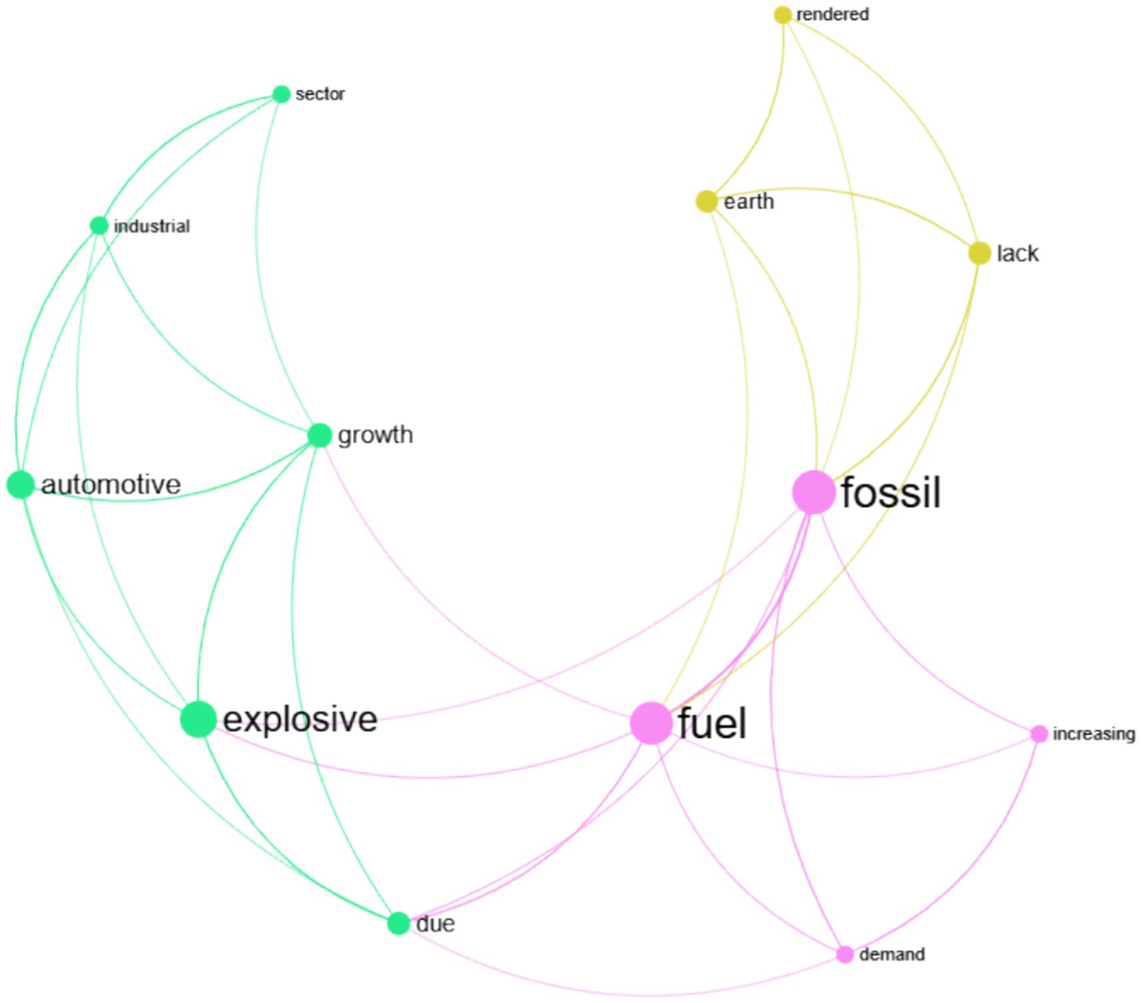 In the relation extraction process, semantic relationships are first identified from unstructured text and mapped as edges connecting concept nodes in the knowledge graph (Ji et al., 2022b). The graph is then analyzed using the Louvain community detection algorithm (Blondel et al., 2008) from network science, which clusters densely connected nodes together. Nodes belonging to the same community are assigned the same color, visually revealing meaningful relational groupings and latent structure within the extracted knowledge. Figure 6 shows such a knowledge graph for the following simplified example: “The ever-increasing demand for fossil fuels due to explosive growth in automotive and other industrial sectors has rendered the earth lacking fossil fuels.”