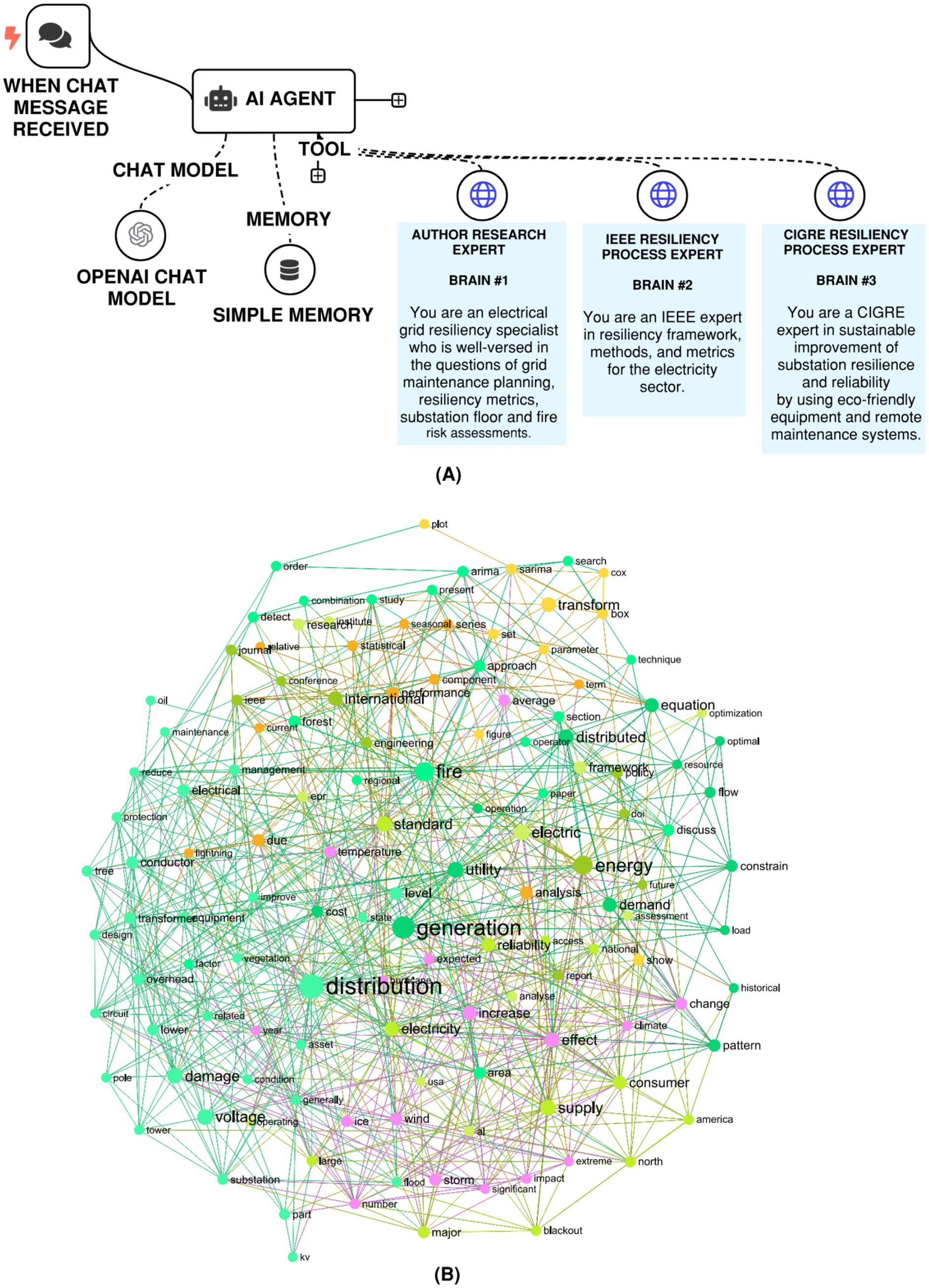 When extended to real-life text-rich applications, knowledge graphs offer powerful capabilities for representing structured knowledge, and these can be combined with an intelligent AI agent inside a knowledge-graph–driven Retrieval-Augmented Generation (RAG) framework. In this setup, the agent does not follow a single linear path but instead navigates across one or more linked knowledge graphs depending on the input prompt. Using the graph structure to guide retrieval, the system is able to capture semantically rich context, highlight hidden connections, and generate answers that are both precise and easier to interpret because they remain tied to structured domain knowledge. Such an approach is particularly useful in engineering research, where overlapping and interdependent domains require contextual representation. To illustrate the concept, three separate knowledge graphs were built, each organized around a specific theme. In this case, the thematic focus was an electrical engineering challenge: enhancing grid resiliency by drawing on both the researcher’s own work and technical reference materials published through IEEE and CIGRE. For demonstration purposes, these three custom-built knowledge graphs, labeled brain 1, brain 2, and brain 3, were created through a manual curation process leveraging the authors’ domain knowledge to support the construction of these knowledge graphs. For more advanced applications, an AI agent can be leveraged to curate the necessary manuscripts before passing them into a knowledge graph for processing. The composition level details for brain 1, brain 2, and brain 3 are as follows: