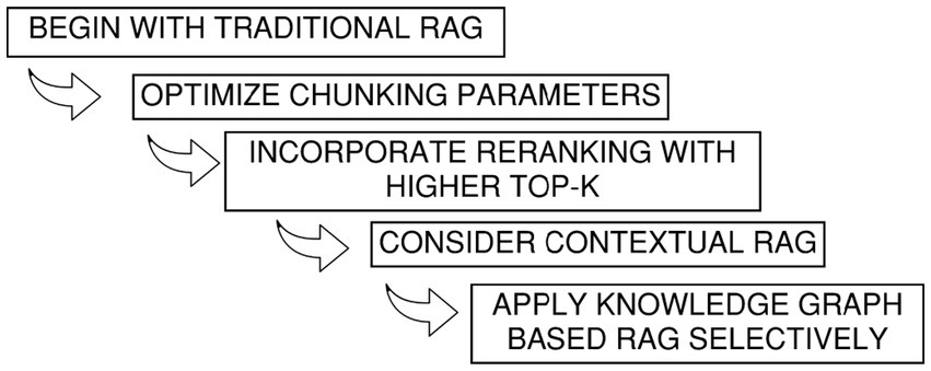 2. Recommendation to reduce API usage: Figure 8 presents a staged approach for rolling out RAG systems with cost in mind. The idea is to begin with conventional setups and only move toward contextual or knowledge-graph–driven RAG when the task at hand truly demands stronger semantic depth or reasoning across domain-specific relationships.