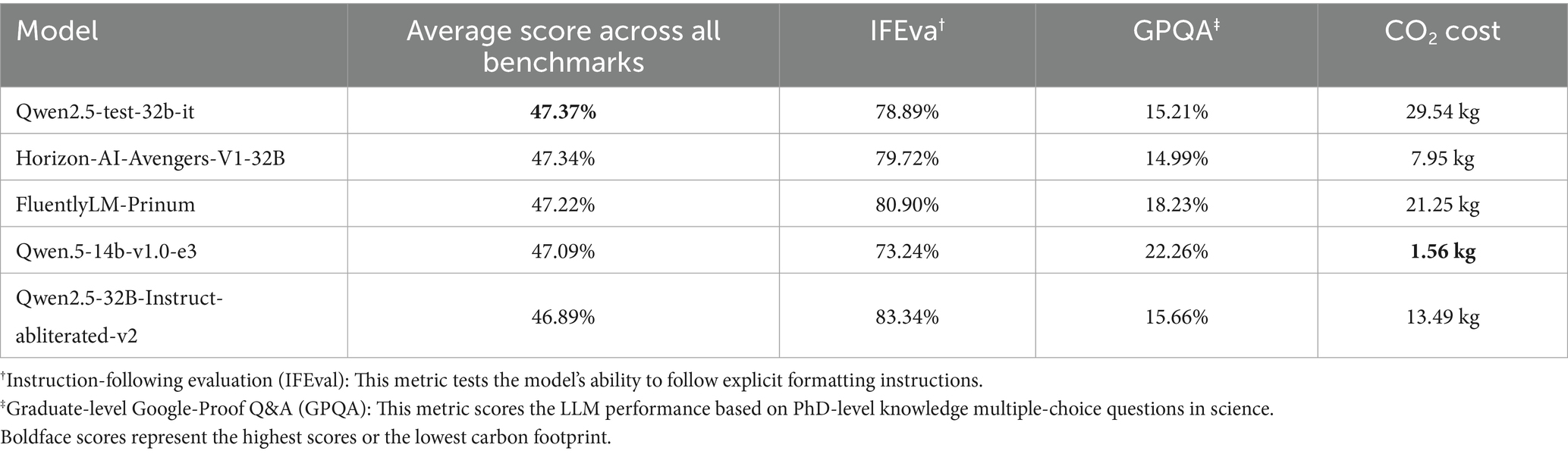 Table 1. Open LLM leaderboard filtered by ‘mid-range’ models and sorted by weighted average of normalized scores from all benchmarks (as of June 2025).
