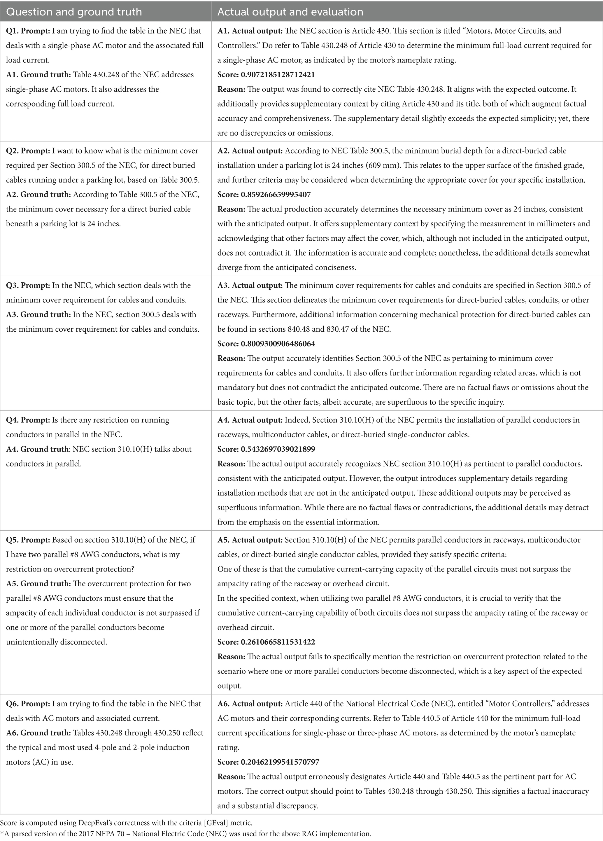 Table 2. Validation of traditional RAG-LLM responses using an n8n workflow on query tasks based on the 2017 National Electrical Code (NEC).