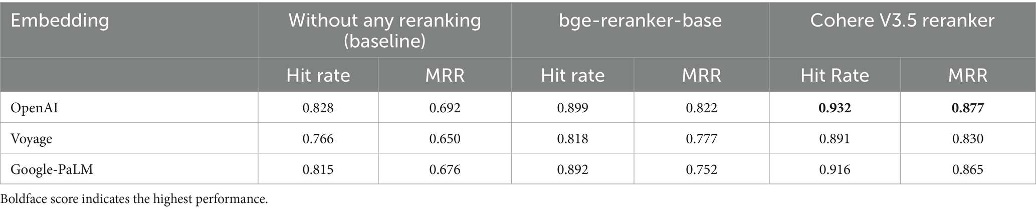 To assess the performance of various embedding models and rerankers, multiple retrieval tests were conducted. Table 3 presents the evaluation results using two standard information retrieval metrics: hit rate and Mean Reciprocal Rank (MRR). Three reranking configurations were compared: