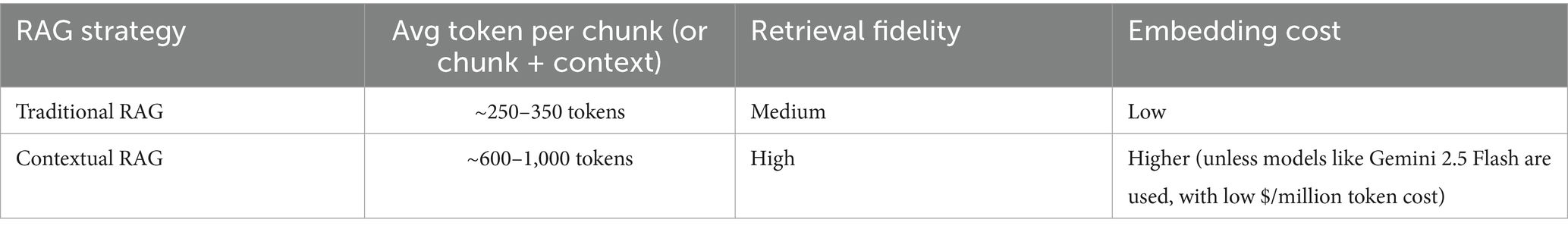 To address this, contextual RAG augments each chunk with its surrounding textual context (e.g., parent sections, headers, or preceding paragraphs) during embedding. This allows the retriever to maintain semantic continuity and structural fidelity. However, this comes at the cost of an increased token volume. Empirically, contextual RAG embeddings can require 2–3 times more tokens per chunk than traditional RAG approaches.