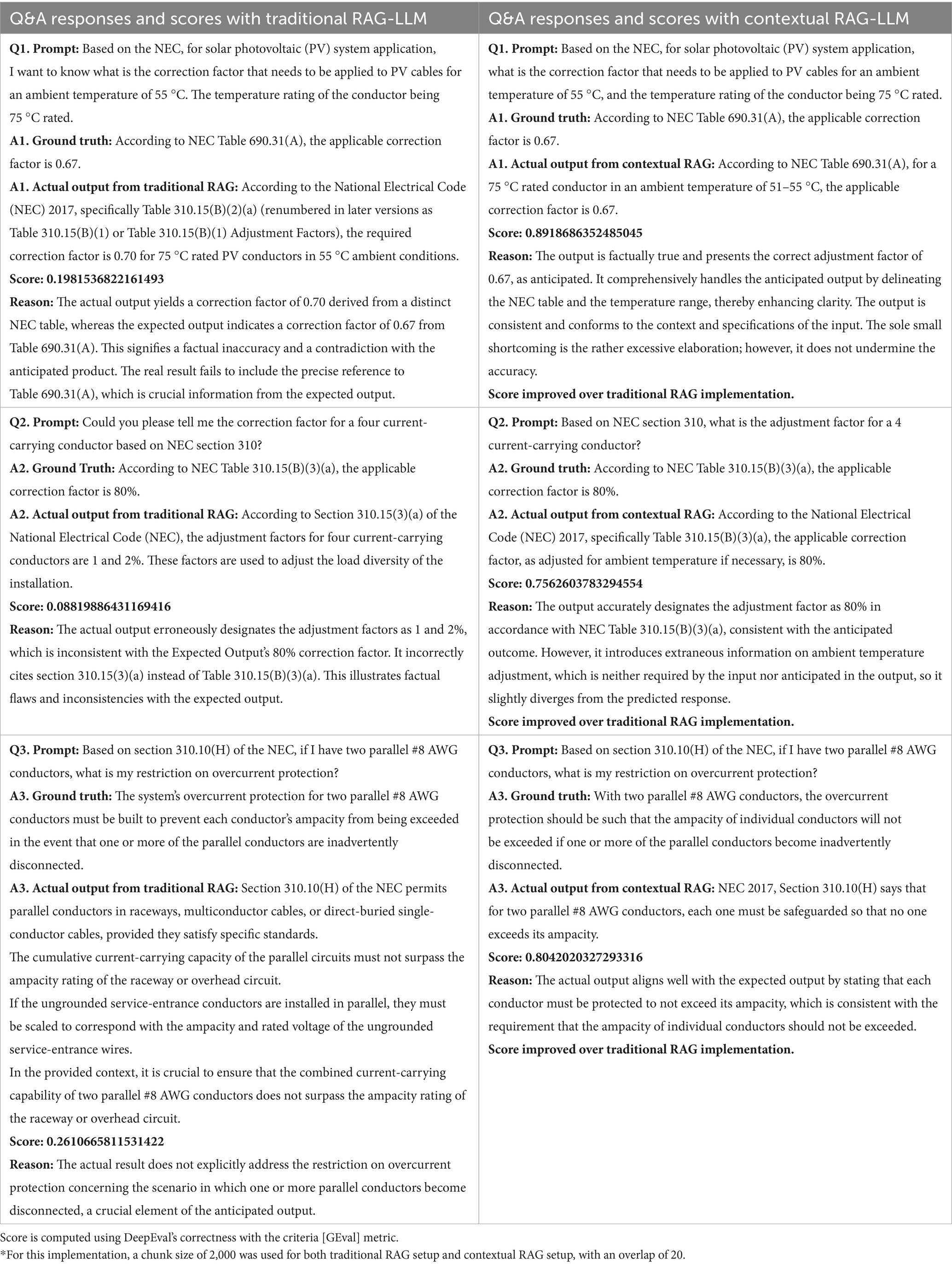 Table 5. Validation of traditional versus contextual RAG-LLM responses using n8n workflows on query tasks based on the 2017 National Electrical Code (NEC).