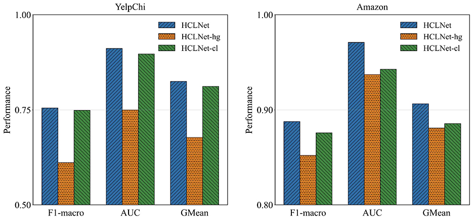 As shown in Figure 2, on both datasets, HCLNet achieves optimal performance across all three evaluation metrics. Removing the hypergraph module and MG-HAM in HCLNet significantly degrades performance, underscoring the critical role of the hypergraph structure in capturing complex fraud patterns. Conversely, while retaining the hypergraph module, removing HDV-CL in HCLNet still results in inferior performance compared to the complete HCLNet, confirming the essential contribution of contrastive learning to feature discriminability. Notably, HCLNet-cl outperforms HCLNet-hg, suggesting that HDV-CL offers stronger robustness even in the absence of the hypergraph structure. Collectively, the synergy between MG-HAM and HDV-CL enables HCLNet to effectively model complex relational patterns and feature invariance for fraud detection.