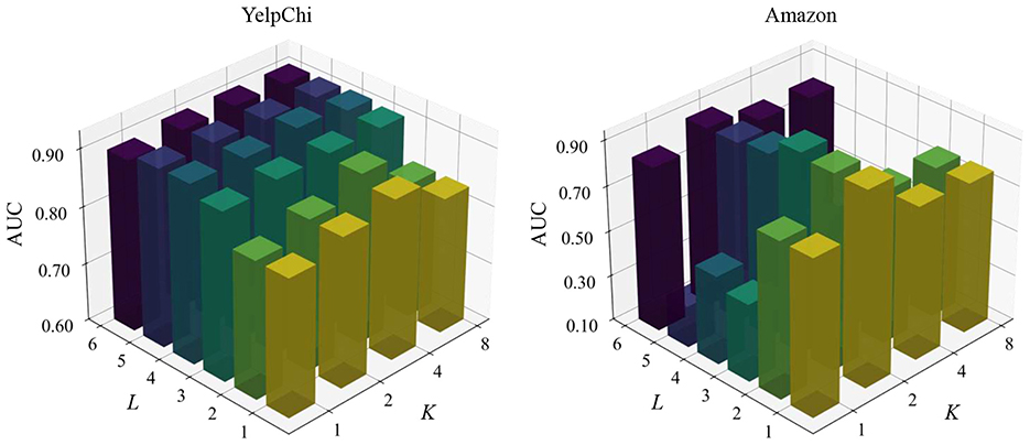 Figure 3. Parameter sensitivity of L and K on YelpChi and Amazon datasets. Note that the values of L range from [1, 2, 3, 4, 5, 6] and K range from [1, 2, 4, 8].
