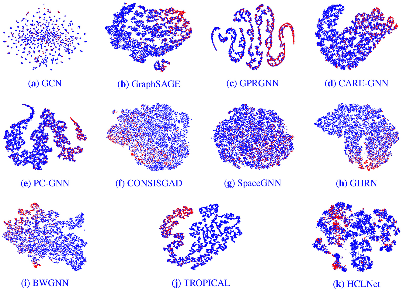 Figure 4. Embedding visualization of different models. The red and blue nodes represent fraudsters and benign entities respectively. (a) GCN. (b) GraphSAGE. (c) GPRGNN. (d) CARE-GNN. (e) PC-GNN. (f) CONSISGAD. (g) SpaceGNN. (h) GHRN. (i) BWGNN. (j) TROPICAL. (k) HCLNet.
