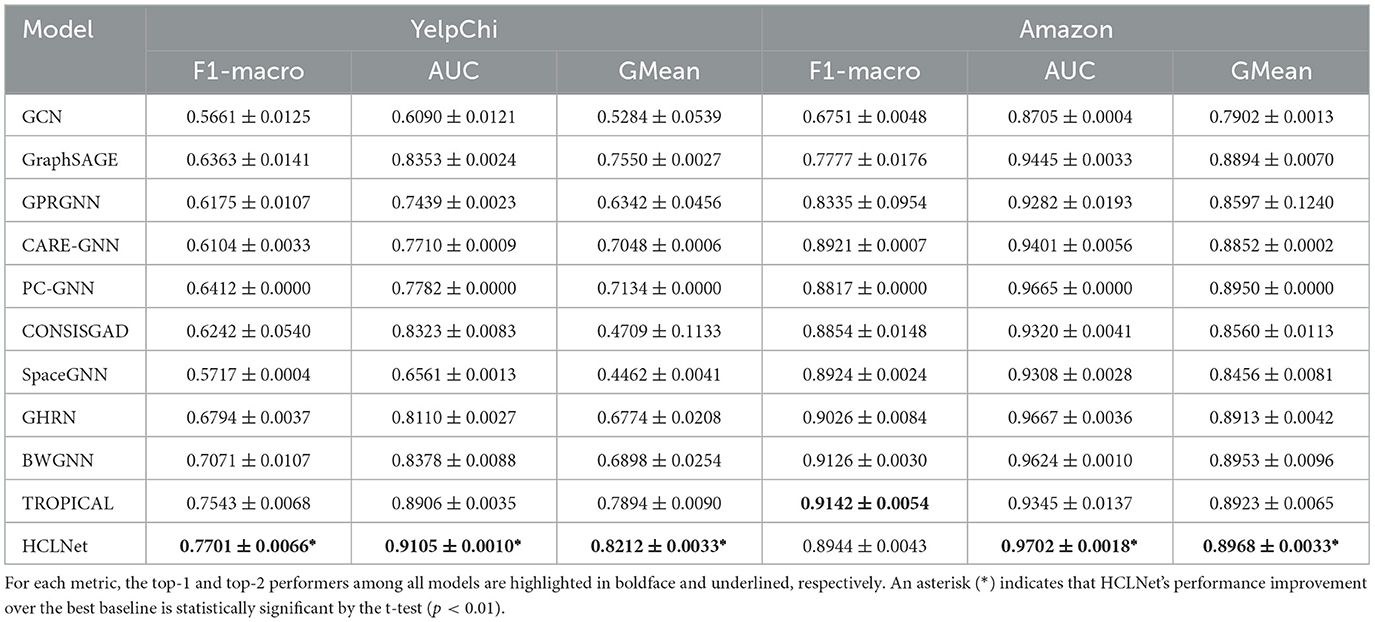 (4) The recently proposed TROPICAL, which employs a Transformer-based hypergraph learning approach to capture high-order relations, has delivered outstanding performance on YelpChi, establishing itself as the optimal baseline and demonstrating the advantage of hypergraph learning in modeling complex high-order dependencies. Our proposed HCLNet achieves the best overall performance while exhibiting distinct characteristics across datasets. On the large-scale and complex YelpChi, HCLNet improves F1-macro, AUC, and GMean by 2.09%, 2.23%, and 4.03%, respectively, over the best baseline TROPICAL, highlighting its strength in challenging scenarios. Although HCLNet's F1-macro is slightly lower than that of BWGNN and TROPICAL on Amazon, it still leads on the other two metrics. This demonstrates that through MG-HAM, and HDV-CL, HCLNet is able to maintain stable and high performance across diverse fraud detection settings.