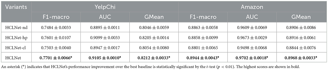 On the basis of confirming the effectiveness of the overall framework, we further deconstruct the HDV-CL by constructing two additional variants: (b1) HCLNet-nd, which removes node-level contrastive learning, and (b2) HCLNet-hp, which removes hyperedge-level contrastive learning, to investigate their individual contributions. The experimental results shown in Table 3 indicate that removing either level of contrastive learning leads to performance degradation, confirming the necessity of the hierarchical design. It is worth noting that the absence of node-level contrastive learning has a more significant impact on the model, indicating that learning discriminative node features is fundamental for improving detection performance. In contrast, hyperedge-level contrastive learning provides valuable supplementary information by capturing group-wise semantic consistency. Together, they form a hierarchical feature learning framework that enhances the model's ability to identify fraud patterns from both individual and group perspectives.