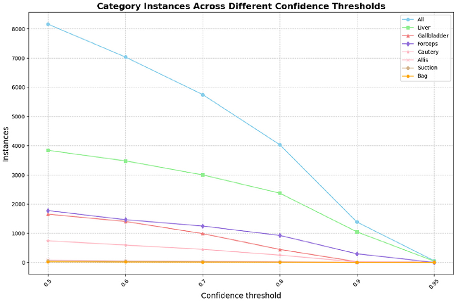 In this part, we introduce LC-YOLO into our LC-YOLOmatch framework and use unlabeled images to further optimize the model. We generate pseudo-labels for the unlabeled images by setting different confidence thresholds τ, as shown in Figure 7, which presents the number of pseudo-label instances generated from 2,550 unlabeled images within the confidence interval of 0.5 to 0.95. Although a higher confidence threshold can filter out more accurate labels, it also leads to a significant loss of annotations, resulting in a linear decrease in the number of annotations. We set the confidence threshold τ to 0.6, with 323 manually labeled images in the training set, and the number of unlabeled images is set to 0 times, two times, three times, and eight times the labeled data, respectively. The validation set and test set are divided as described above. As shown in Table 9, our LC-YOLOmatch framework can effectively utilize unlabeled data resources to improve the model. Based on the overall instance segmentation results of the test set, it can be seen that the LC-YOLOmatch with unlabeled data achieves an average improvement of 16.6% in the Mask(P) metric, 8% in the Mask(R) metric, 9.7% in the Mask (F1) metric, 14.2% in the mAP50 metric, and 9.8% in the mAP50-95 metric compared to the LC-YOLO model. Among them, the best performance is achieved when the ratio of labeled to unlabeled data is 1:2 and 1:3. An excessively high proportion of unlabeled data may introduce too much noise and lead to performance degradation. As shown in Figure 8, compared to the initial baseline model yolov11, our improved LC-YOLOmatch achieves a comprehensive performance improvement. We conducted tests using the publicly available standard laparoscopic cholecystectomy video provided by the Institute of Research and Innovation in Digestive Surgery (IRCAD) Cancer Center for the Digestive System in France (a globally renowned minimally invasive surgery training center) (Mutter and Marescaux, 2004). As shown in Figure 9, this figure presents the test scene from the surgical video.
