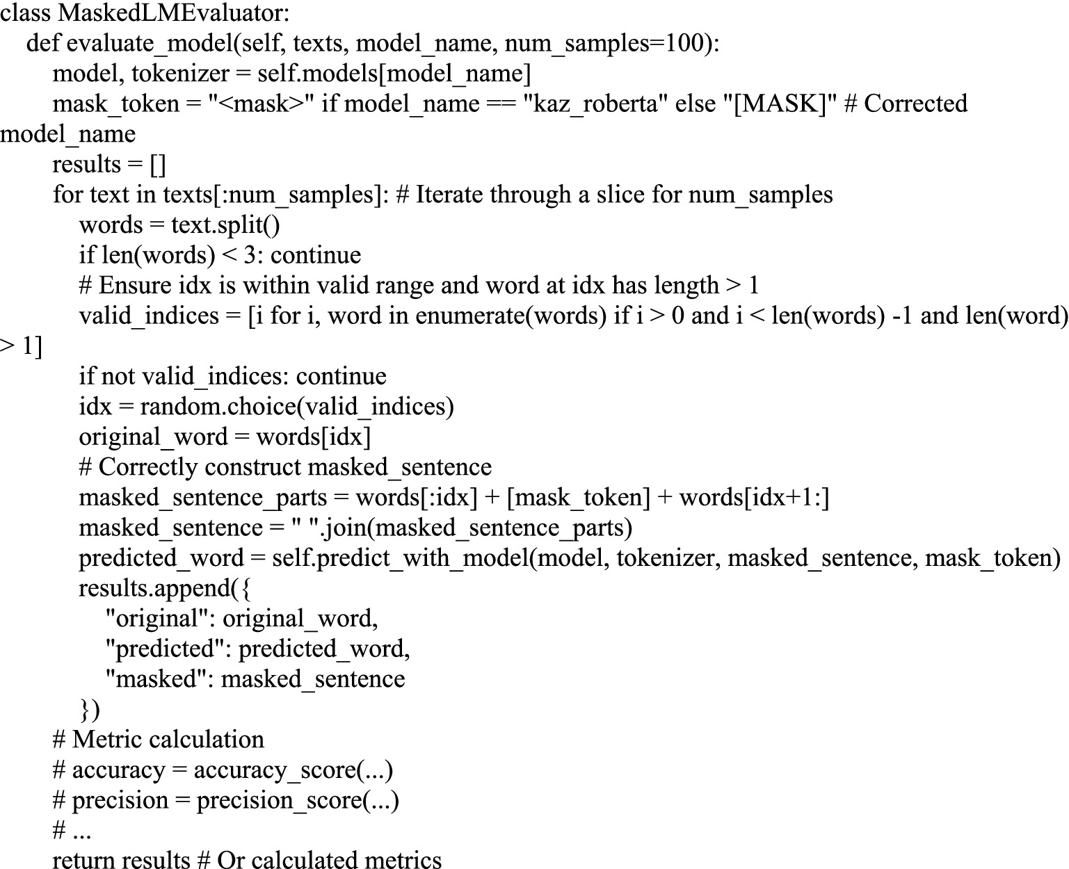 As part of this research, the prediction quality of two language models was also evaluated: KazRoBERTa and mBERT, applied to tasks of morphological analysis and automatic text processing in the Kazakh language. These models were chosen due to their Transformer architecture and ability to generalize in conditions of limited language resources. For evaluation, the Masked Language Modeling task was used, which indirectly measures how deeply the model “understands” the morphological structure of word forms. This approach is especially important for the Kazakh language, which has an agglutinative nature, since successful restoration of masked morphemes requires not only knowledge of vocabulary but also understanding of grammatical dependencies within a word.