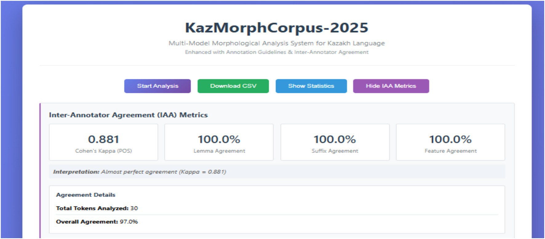 To assess the quality and consistency of the annotation, an experiment was conducted involving two qualified linguists, who independently annotated a corpus of 500 representative tokens. Inter-annotator agreement (IAA) was evaluated using Cohen’s Kappa coefficient for Part-of-Speech tags, exact match percentage for lemmas and affixes, and the F1-score for grammatical features. The results demonstrate a high level of consistency: Cohen’s Kappa reached 0.847, which, according to the classification by Li et al. (2023) and Duran et al. (2022) corresponds to “almost complete agreement.” The agreement percentage for lemmas was 92.3%, for suffixes—89.7%, and for grammatical features—85.2%.