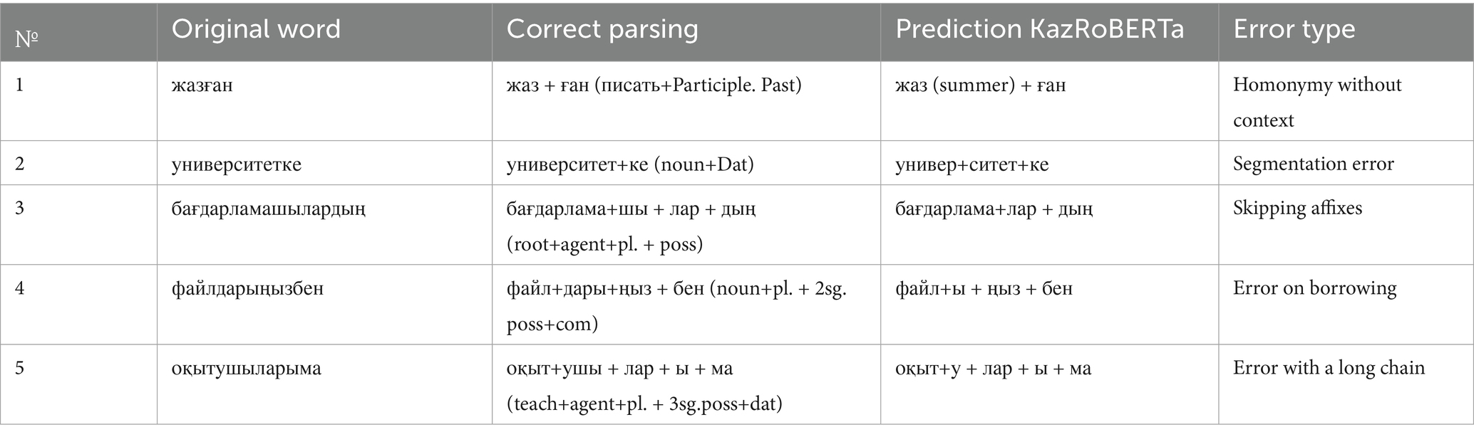 The experiments confirmed the effectiveness of the proposed approach. KazRoBERTa consistently outperformed mBERT across all metrics—Accuracy, Precision, Recall, F1-score, and Jaccard coefficient (Devlin et al., 2019)—while also being more computationally efficient in prediction. The hybrid system achieved over 90% accuracy in morphological tagging, which aligns with state-of-the-art results for agglutinative languages (Sultanova et al., 2019; Washington et al., 2014). Error analysis showed that the system successfully resolves most cases of disambiguation, with remaining errors primarily linked to insufficient context in homonymy, long affixal chains, and borrowed words.