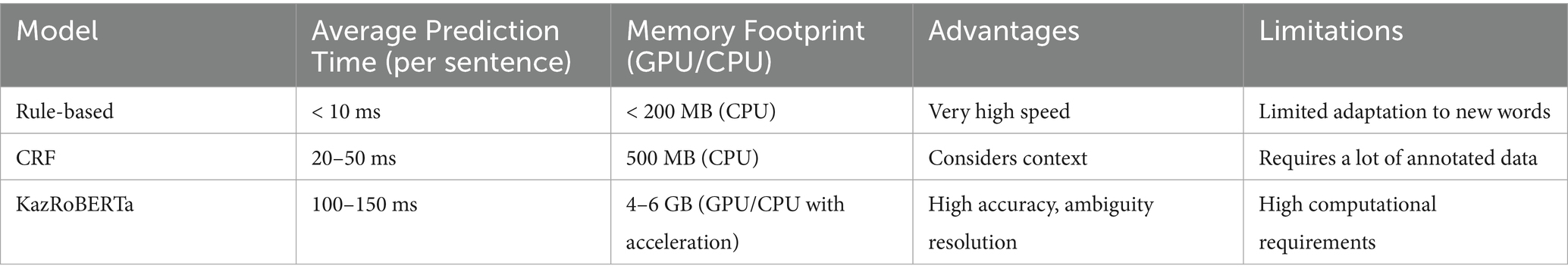 Integration of the transformer-based neural layer substantially increases computational requirements. Table 3 documents that GPU-accelerated KazRoBERTa inference achieves throughput of 670 tokens per second with latency of 1.49 milliseconds per token and memory consumption of 5.8 gigabytes. Application of post-training INT8 quantization improves efficiency: quantized KazRoBERTa achieves 1,060 tokens per second throughput with reduced latency of 0.94 milliseconds per token and memory consumption of only 1.5 gigabytes, representing a 64.3% reduction in memory footprint relative to full-precision inference.