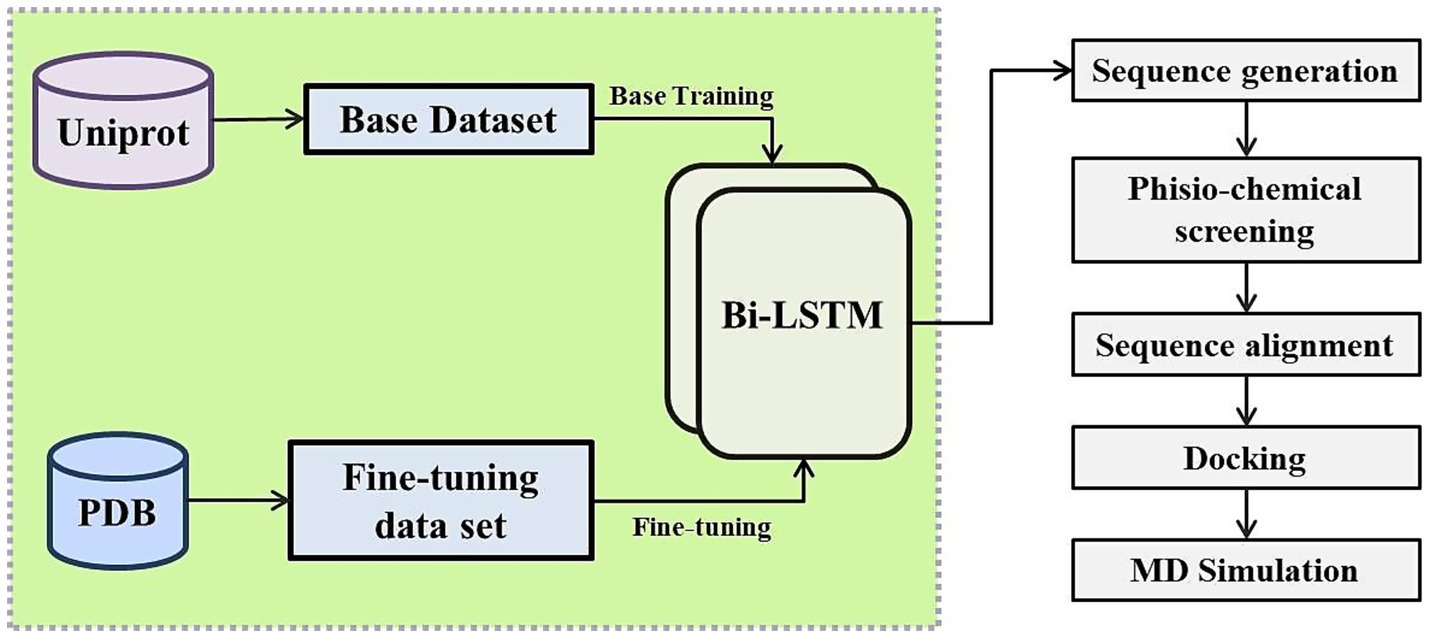 Recent advances in artificial intelligence (AI) provide new opportunities to address these challenges by incorporating large biological datasets and machine learning/ deep learning algorithms (Fabrizio et al., 2021). LSTM-based models have been applied to identify bioactive motifs, CNN-BiLSTM hybrids to predict multifunctional peptide activities, and generative frameworks to design antiviral peptides (Fabrizio et al., 2021; Xiao et al., 2021; Li et al., 2022). Docking and molecular dynamics (MD) simulations have further elucidated Aβ interaction mechanisms (Urbanc et al., 2004; Mandal et al., 2006; Zhang et al., 2021). Yet, most approaches remain fragmented, focusing either on predictive modeling or structural analysis without fully integrating AI-driven peptide generation with physics-based validation.