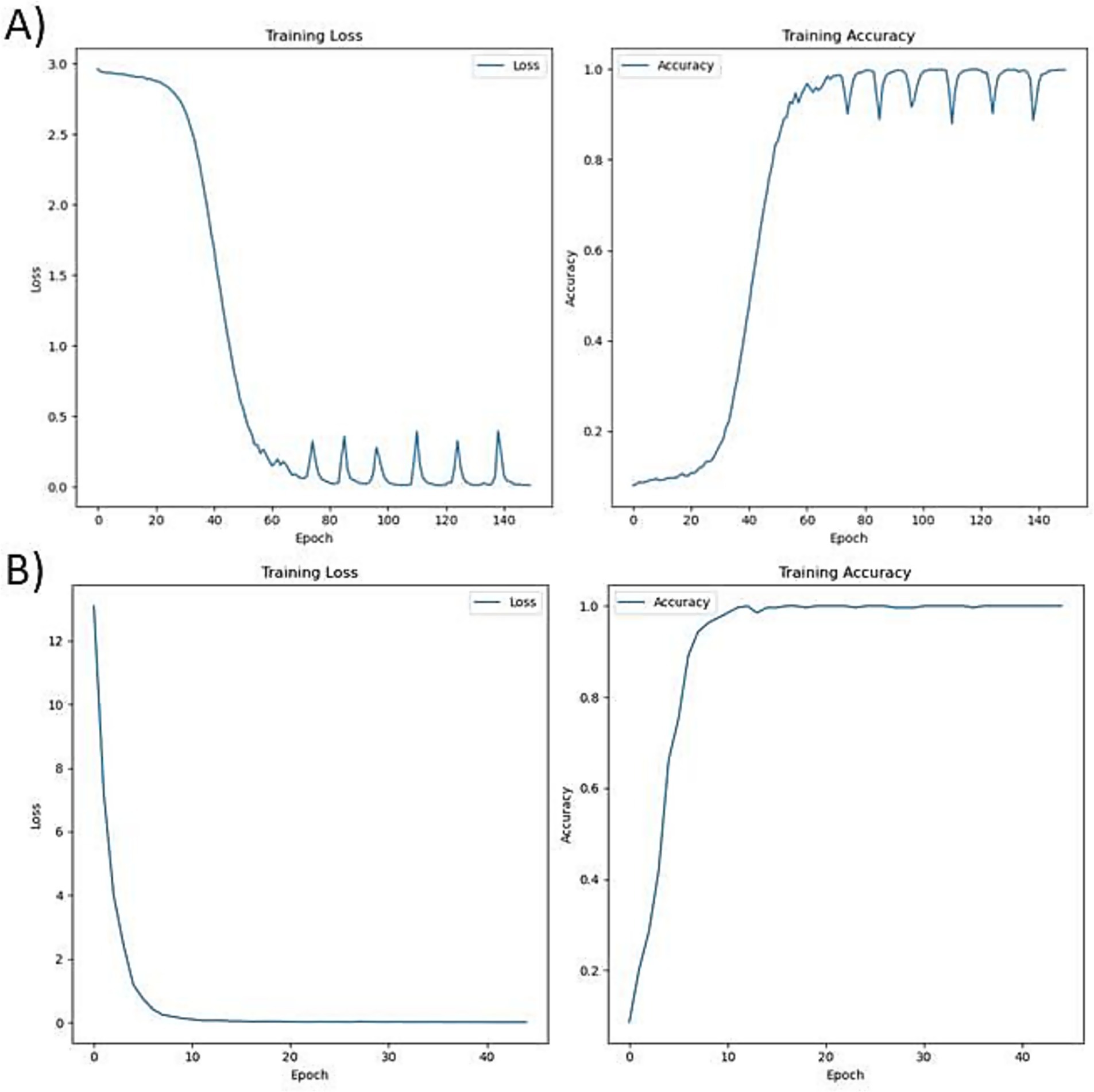 Figure 2. Training performance of the BiLSTM model, (A) Base training on full-length Aβ-interacting UniProt proteins showing rapid convergence of loss and accuracy stabilization, (B) Fine-tuning on short, experimentally validated peptides exhibits low training loss and high accuracy.