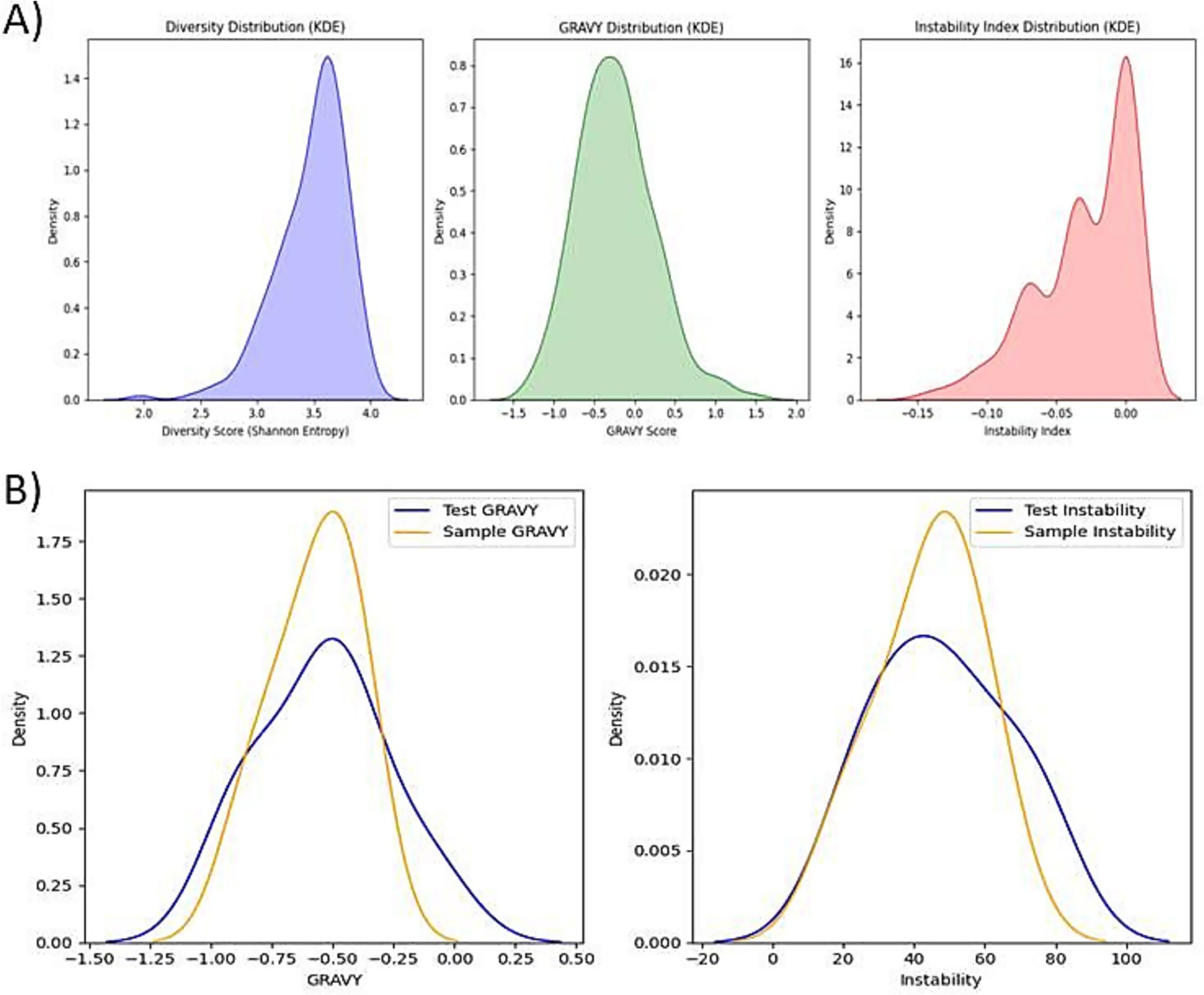 Figure 3. Physicochemical property distributions of generated peptides, (A) Distribution profiles of sequence diversity, GRAVY, and instability index among all 1,000 generated peptides showing broad variation, supporting diversity and favorable biophysical characteristics. (B) GRAVY and instability index distributions of generated peptides compared to sample proteins demonstrating substantial overlap.